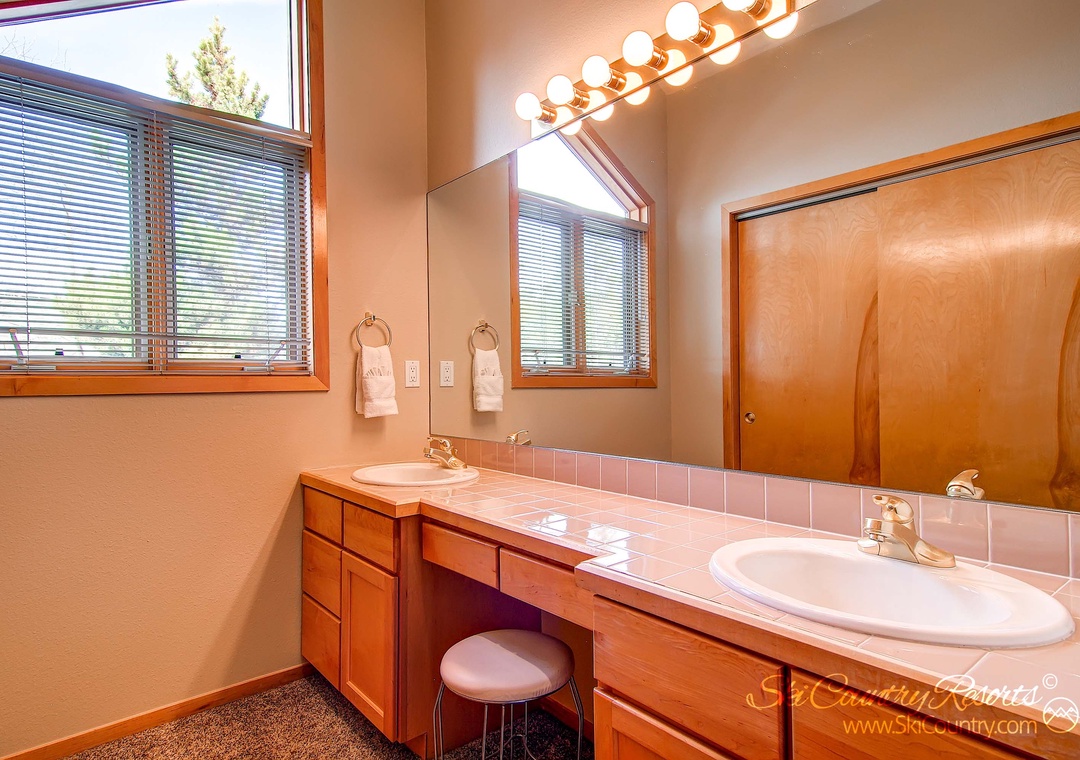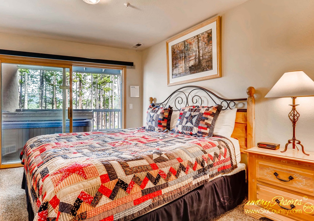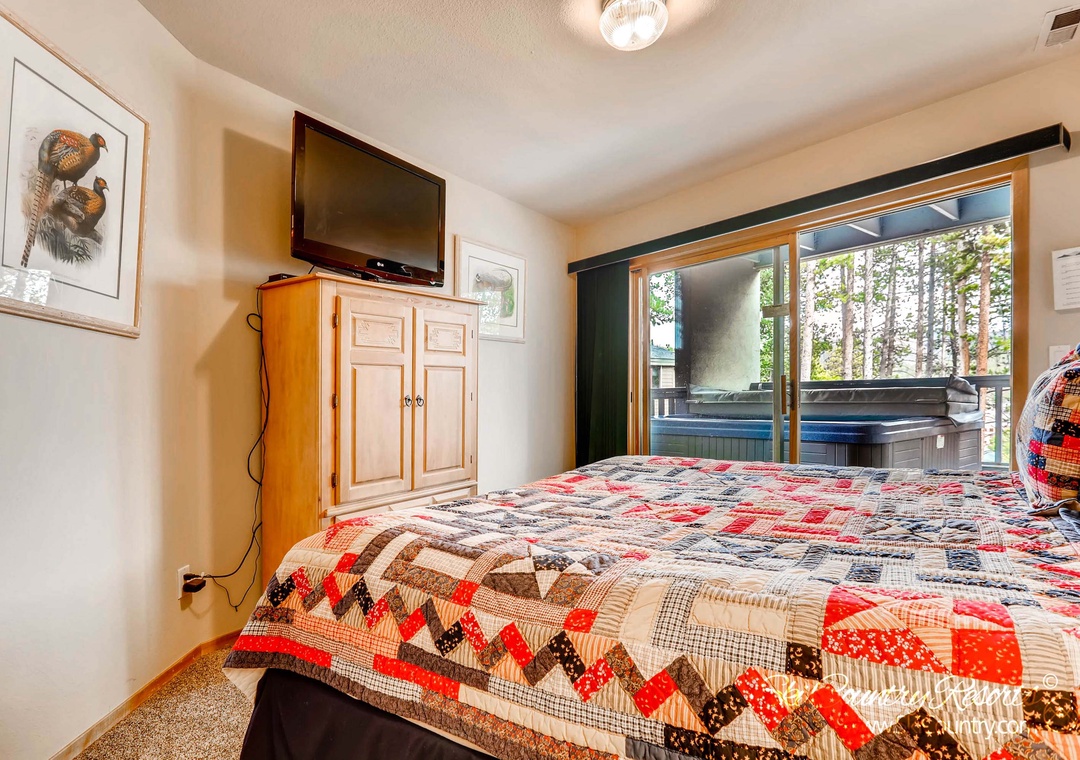 When it's time to retire for the night, the cozy master bedroom awaits. Furnished in natural wood and featuring a comfortable King bed, flat-screen TV, and ample dresser space for your belongings. The attached, private master bathroom offers double sinks, a convenient make-up vanity, and a luxurious Jacuzzi tub. However, the pièce de résistance of this master bedroom is the private patio accessed through sliding glass doors, offering breathtaking views of the majestic mountains. Imagine sipping your morning coffee here, basking in the warm sunlight with only the great outdoors for company.