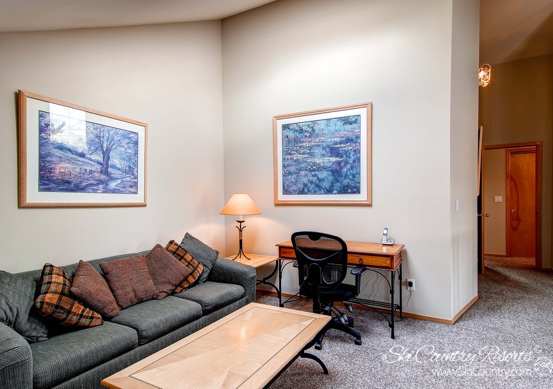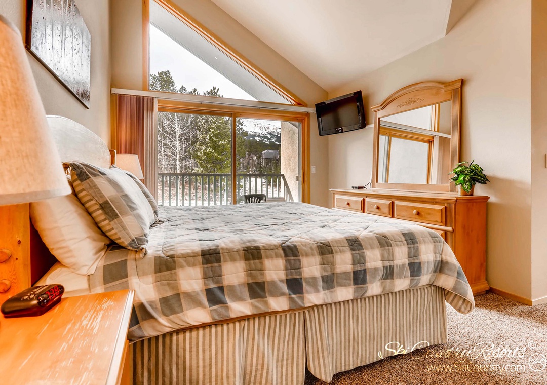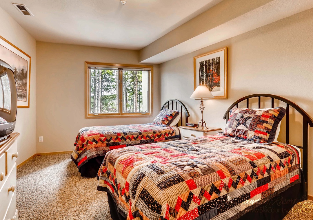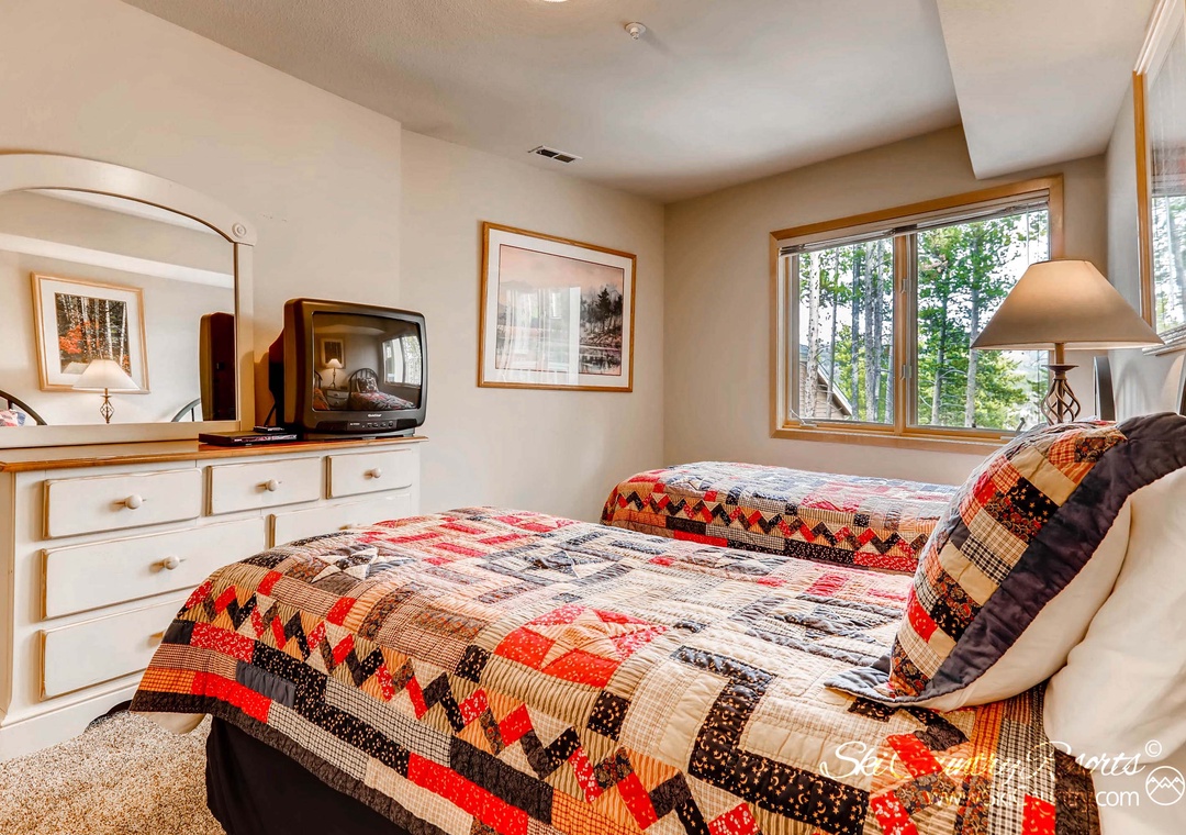 The second bedroom boasts two inviting Twin beds adorned with cozy quilted bedding and its own private TV. Meanwhile, the third bedroom boasts a King bed, flat-screen TV, and quick access to a deck featuring the unit's private hot tub - making it perfect for apres-ski relaxation. For those seeking additional sleeping space or a moment of solace, the upstairs loft includes a private retreat with sofa that converts into a Queen sofa sleeper, as well as a small desk for any business needs.