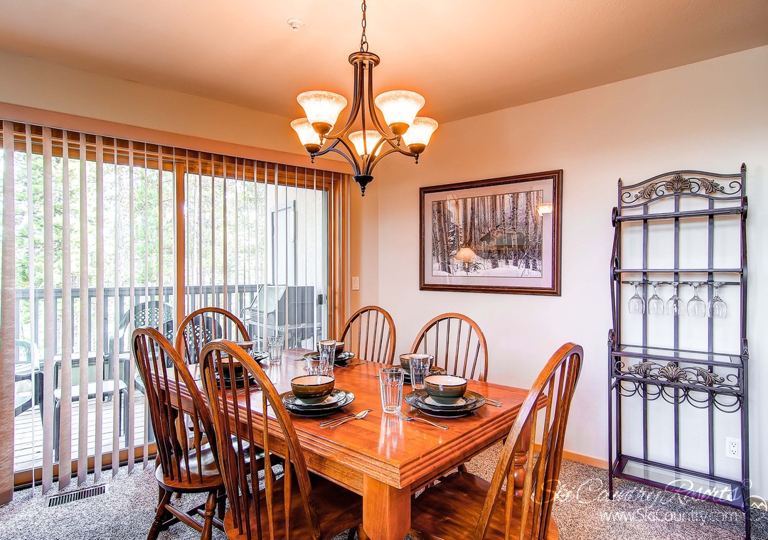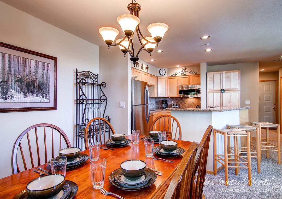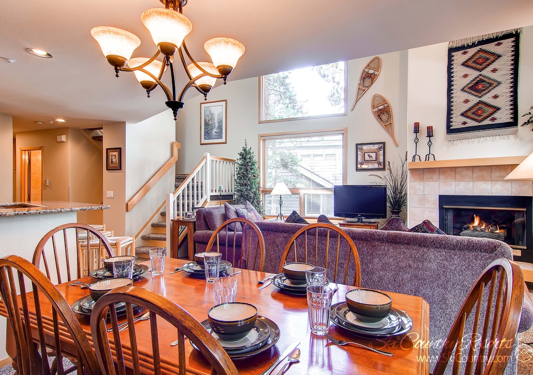 As you step inside, you'll be instantly captivated by the distinctive ski-inspired decor that infuses warmth and character into every corner of this 1,740-square-foot tri-level townhome. The open design welcomes you with a living room that centers around a crackling gas fireplace, a flat-screen TV complete with a DVD player, and sumptuous seating on plush couches. Large windows bathe the space in natural light, creating an inviting ambiance that's perfect for unwinding after a day of mountain adventures.