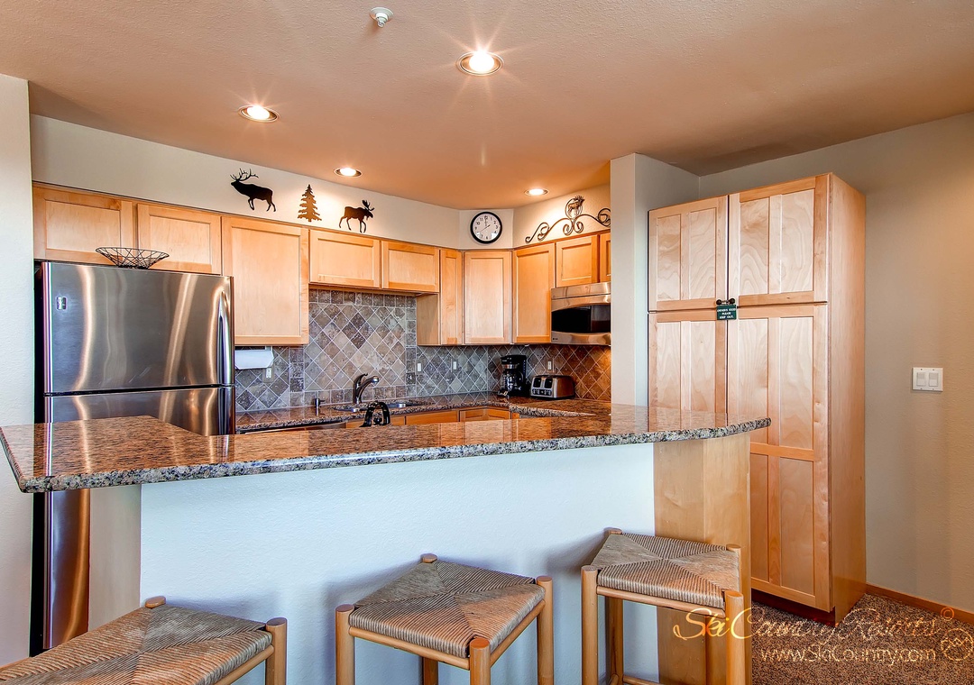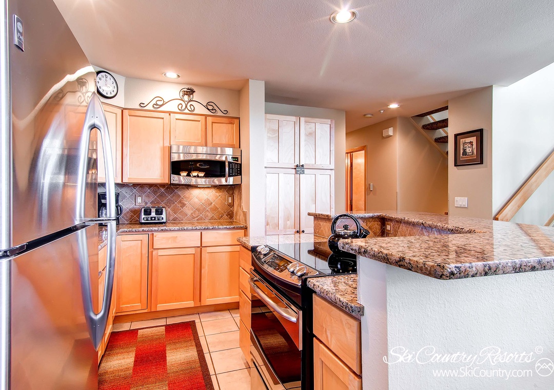 Adjacent to the living area, you'll discover a fully-equipped kitchen that's ready to cater to your every culinary desire. Boasting granite countertops, wood cabinetry, and state-of-the-art stainless steel appliances, including a dishwasher, microwave, stove, oven, toaster, coffee maker, and refrigerator. And, nearby, the rustic wood dining table (with seating for 6) invites you to gather for memorable meals. Here, you can savor the joy of a home-cooked meal from the comfort of your own mountain retreat.