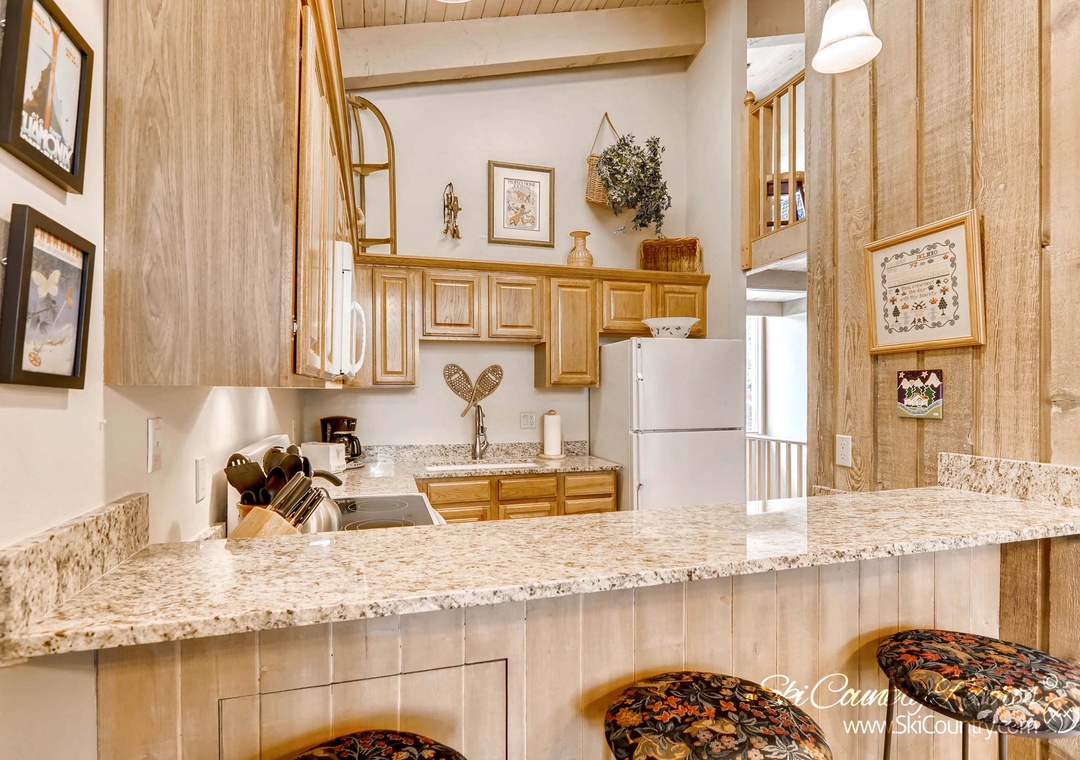 The fully-equipped kitchen boasts all the essential appliances, including a dishwasher, coffee maker, toaster, stove, oven, microwave, and refrigerator. Cooking and dining utensils, as well as glassware and dishware, are readily available. For a quick bite, gather around the three-seat breakfast bar.