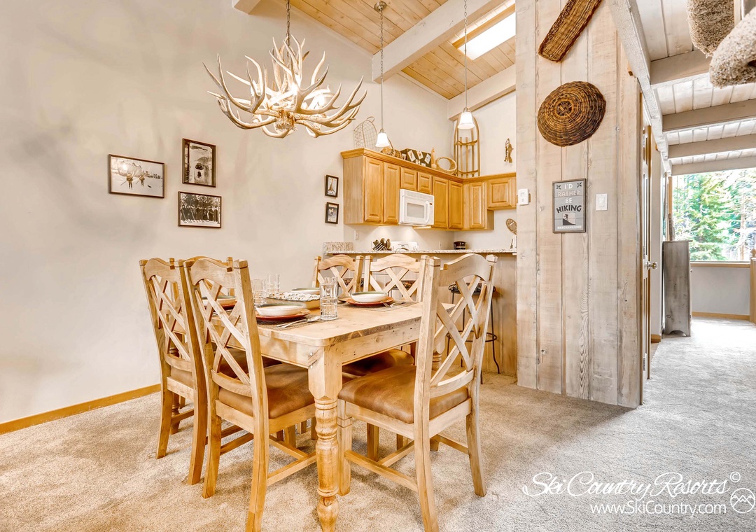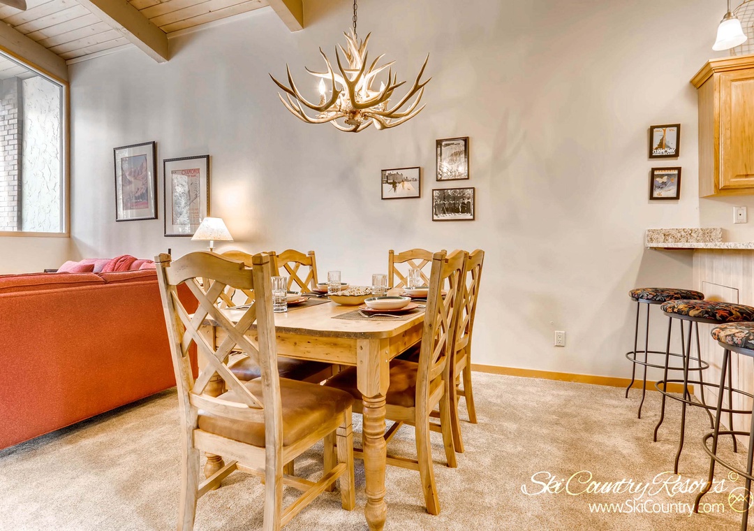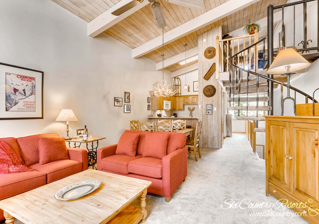 Step inside this spacious townhome, and you'll immediately feel the warmth of the mountain-inspired decor. The living and dining areas boast stunning tongue and groove, beam vaulted ceilings, creating a cozy and inviting atmosphere. As you enter the living room, you'll be greeted by two comfortable couches and a side chair, all centered around a large, rock-faced gas fireplace – the perfect place to unwind with friends or dive into a good book. The common area TV discreetly hides within an armoire, allowing you to choose between relaxation and entertainment. Flooded with natural light streaming through floor-to-ceiling windows, the living space exudes a welcoming ambiance.