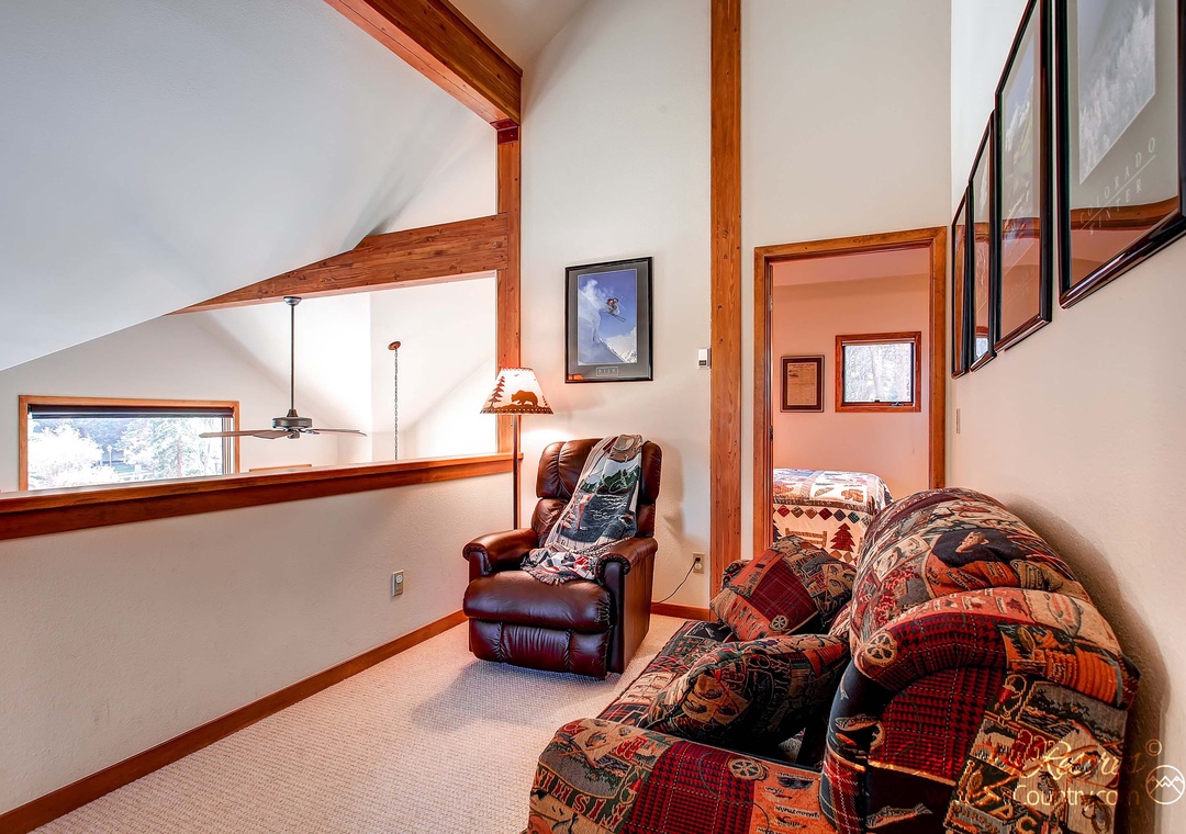 Ascend upstairs to the overlook loft, offering a plush couch for lounging or a tranquil spot for indulging in a captivating book in the leather side chair recliner. The second bedroom, also located upstairs, boasts a new queen bed and a vaulted ceiling design that bathes the room in natural light. Unwind before bedtime with your vacation book, seated in the sumptuous leather chair bedside. The third bedroom on the upper level is thoughtfully furnished with a queen bed and an additional twin bed, accommodating the comfort of every guest. For additional sleeping arrangements, the downstairs area features a queen sofa sleeper, allowing a total capacity of up to nine people.