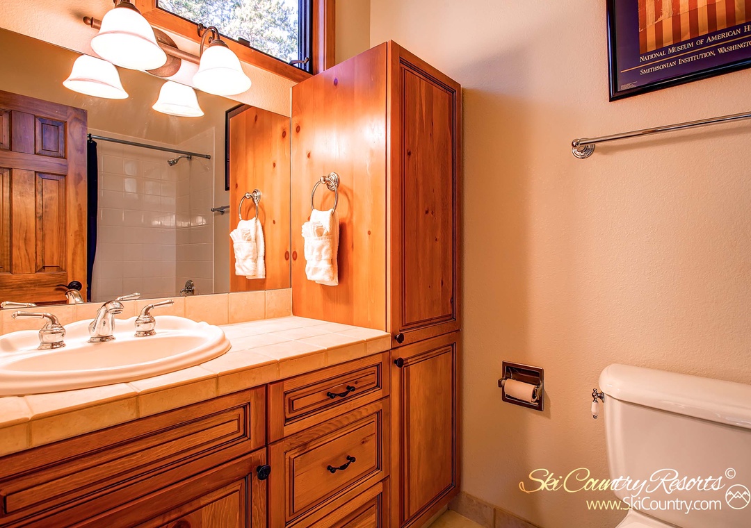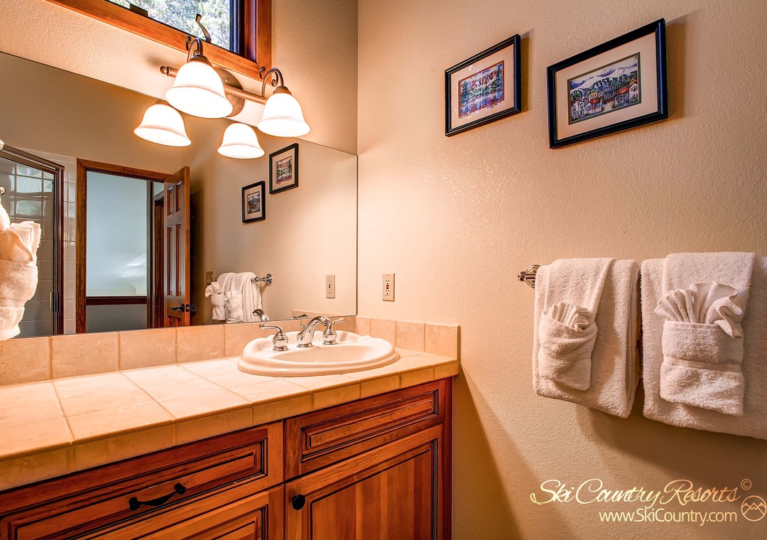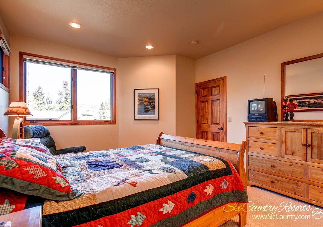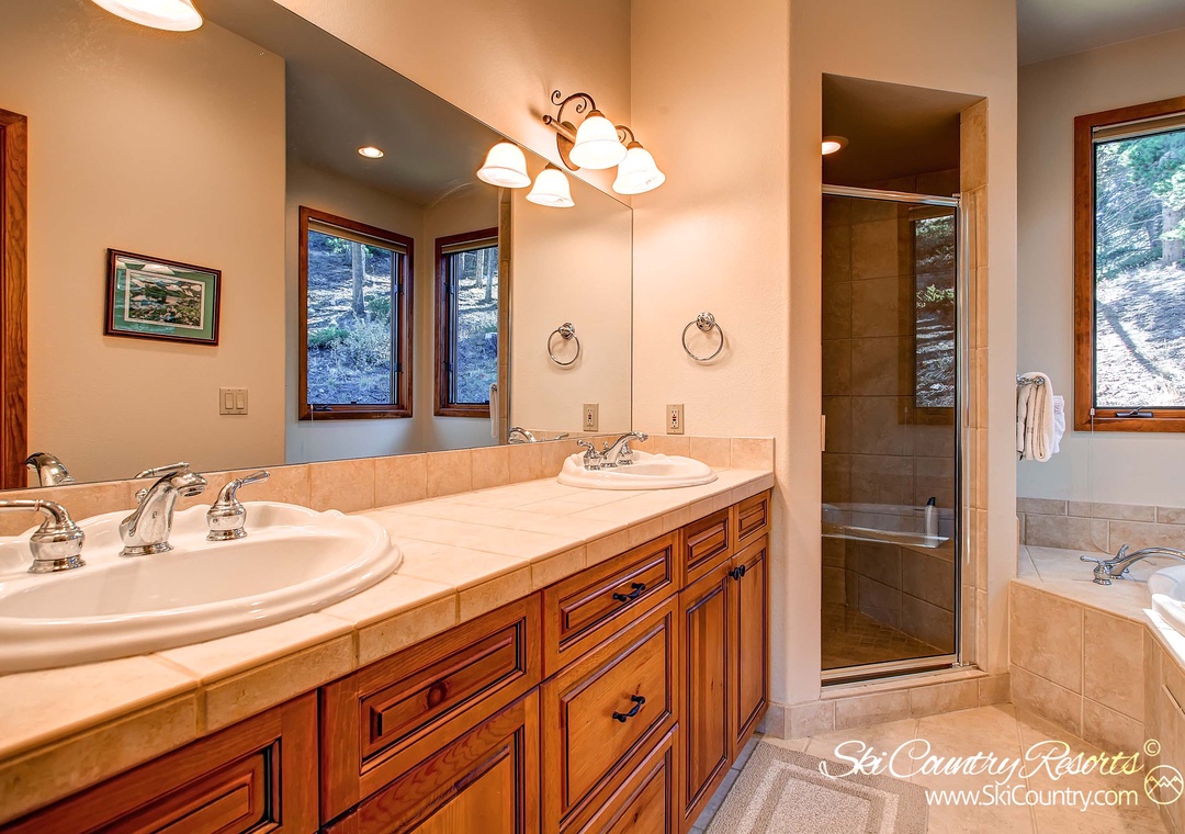 Retreat to the large master bedroom, adorned with a brand-new queen bed, mountain-inspired decor, and elegant wood furniture. Relax in the cozy side chair recliner and relish the forest views while catching up on your favorite shows on the 26" flat screen TV. The master bathroom is a haven of luxury, equipped with two sinks, a spacious tiled shower, and a full-size jetted bathtub.