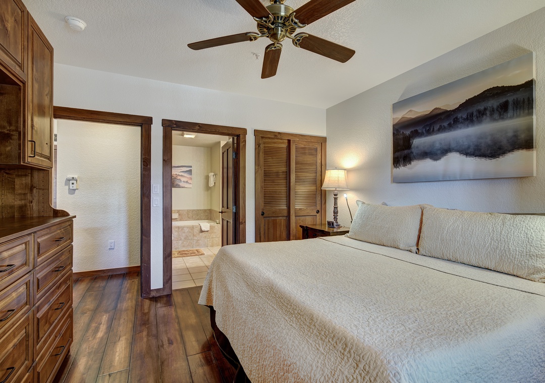 Enjoy the views of the Blue River from your own private balcony. With room to spread out, there is a bedroom with a king bed and plenty of storage and there's a fold out sleeper sofa in the living room - perfect for families or couples. Relax and watch TV in the living room or the bedroom and take advantage of the free Wi-Fi.