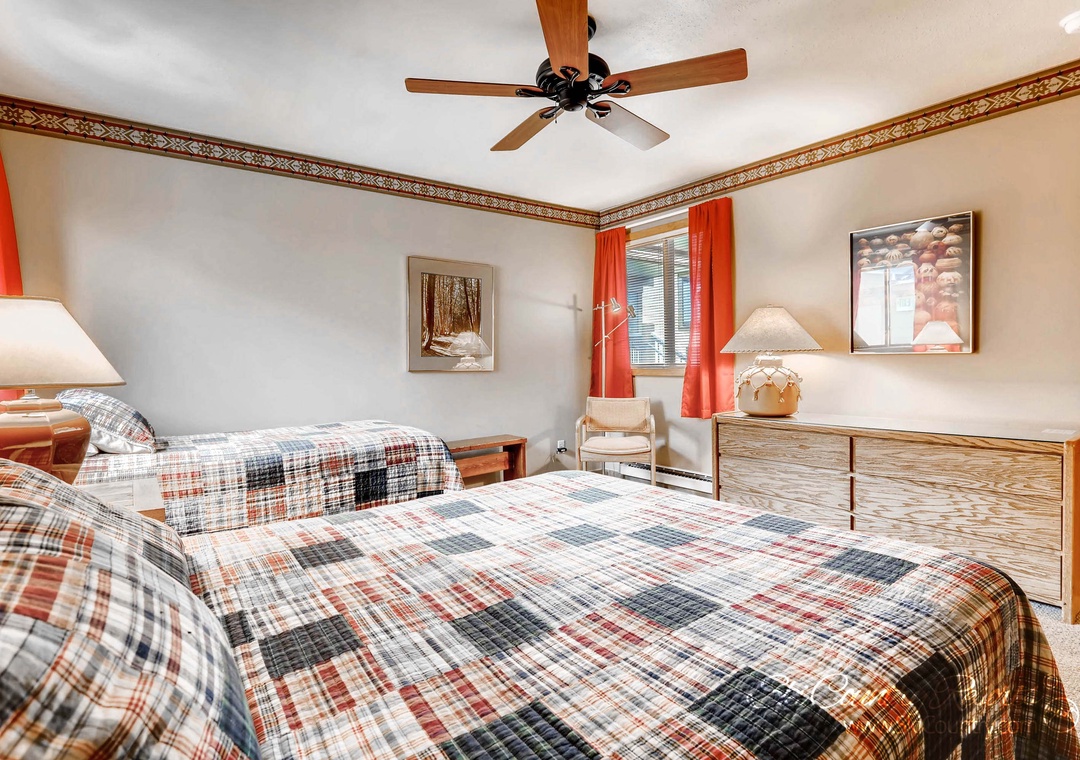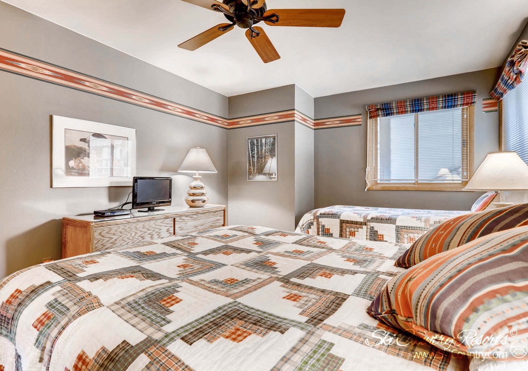 In the second bedroom, you'll discover a spacious wood dresser, a flat screen TV, and a cozy Queen bed accompanied by a Twin bed, ensuring a restful and enjoyable stay for all guests.