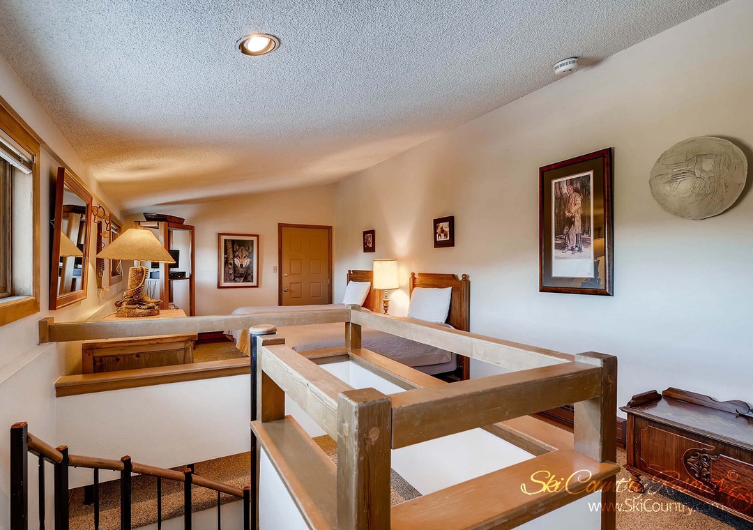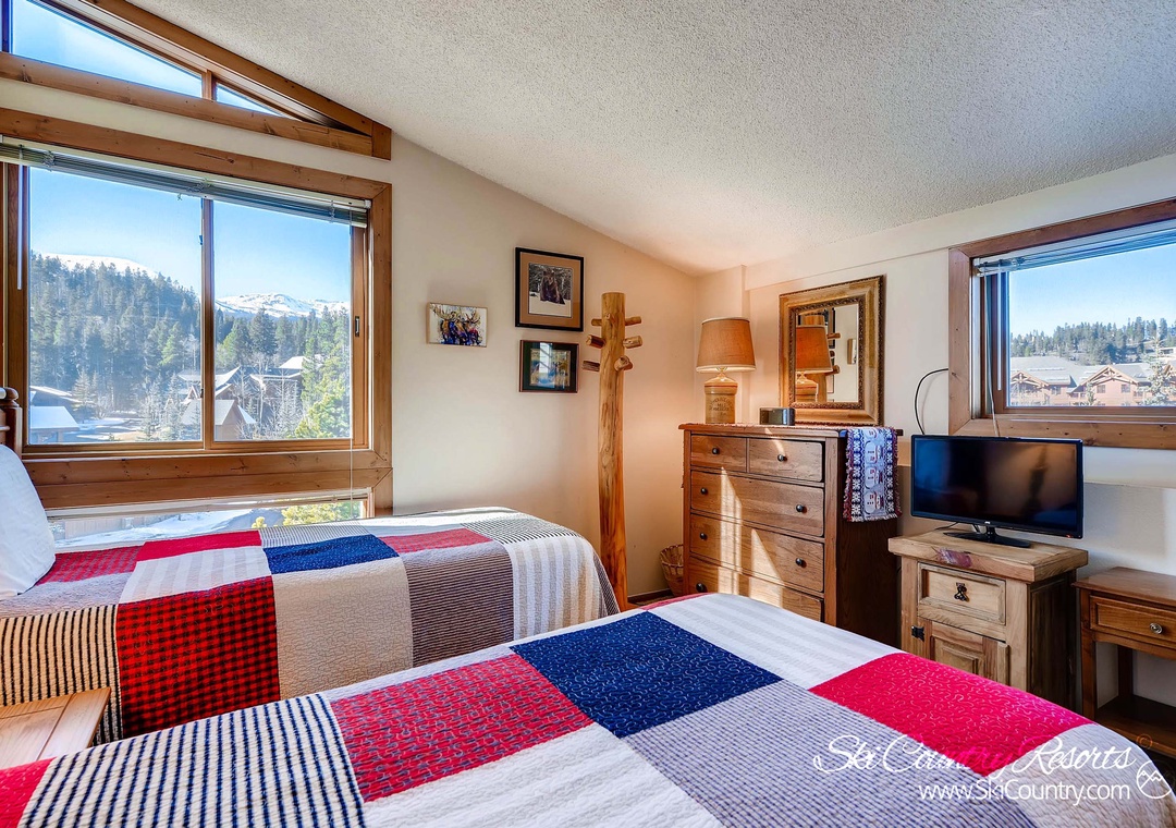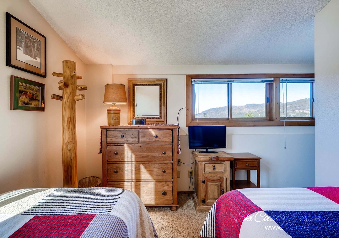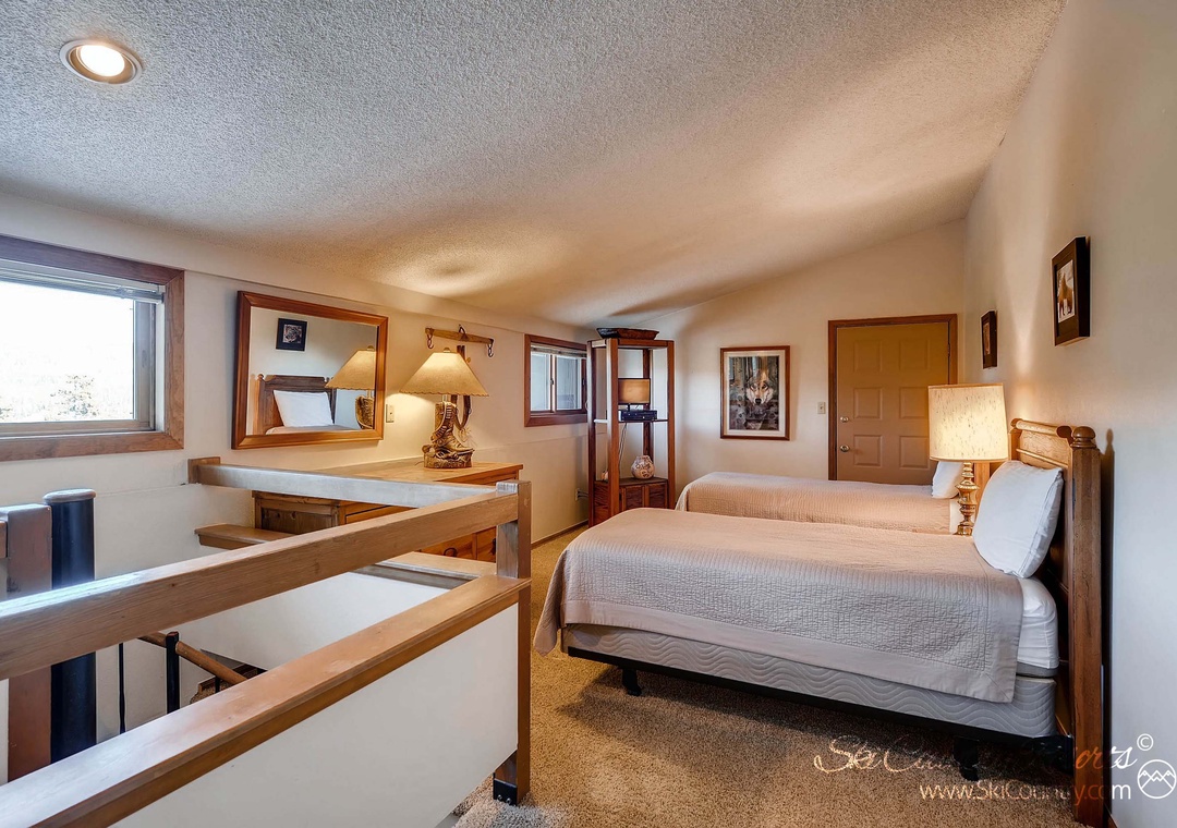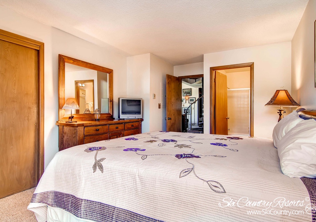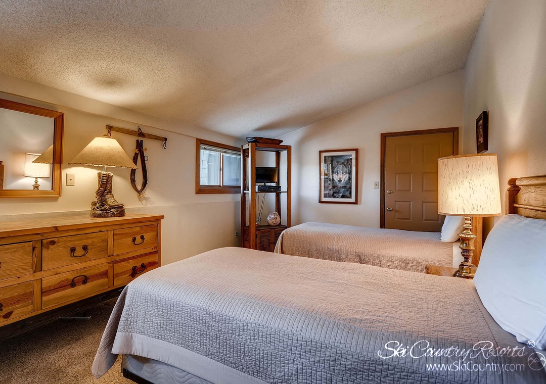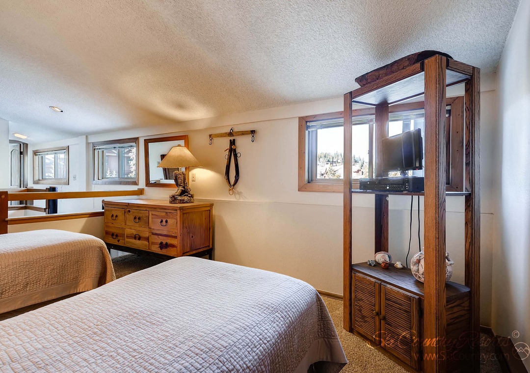 The master bedroom of this roomy condo exudes comfort, featuring a TV, King bed adorned with cozy floral bedding, and elegant wood furniture throughout. This bedroom also offers a private, attached master bathroom, ensuring a tranquil and secluded space. Venture to the upstairs loft, where you'll discover two Twin beds, a TV, a dresser for storage, and a small stereo entertainment center, offering an inviting space for relaxation. The second upstairs bedroom provides two Twin beds dressed in comfortable bedding, complemented by a TV and a delightful bedside window. Additionally, the Queen sofa sleeper accommodates a total eight guests comfortably throughout the unit.