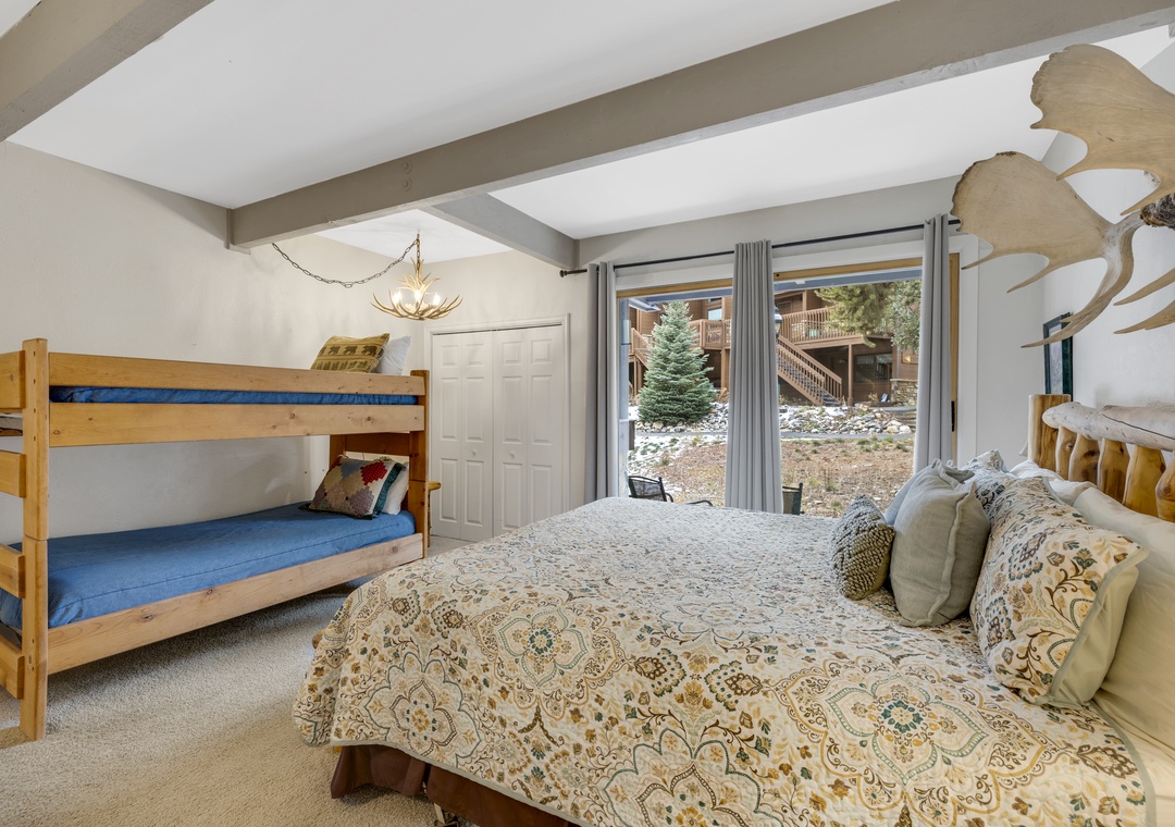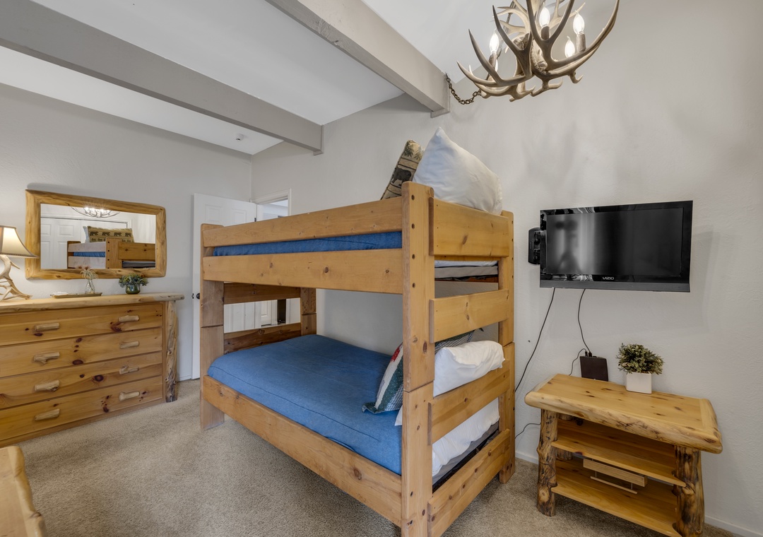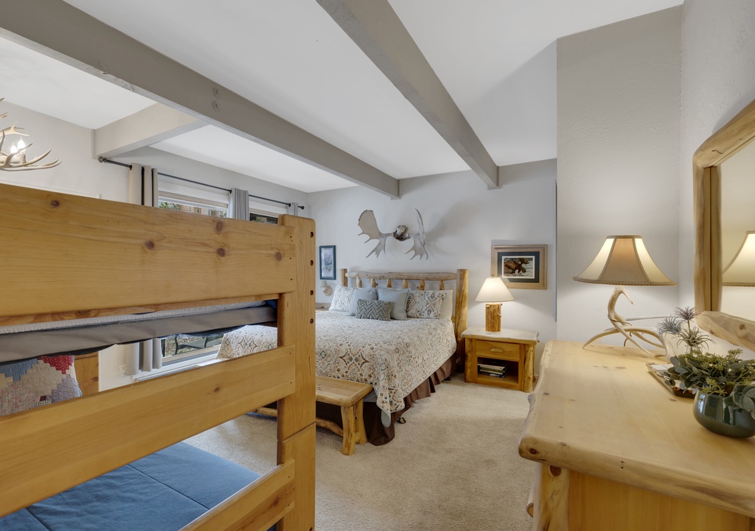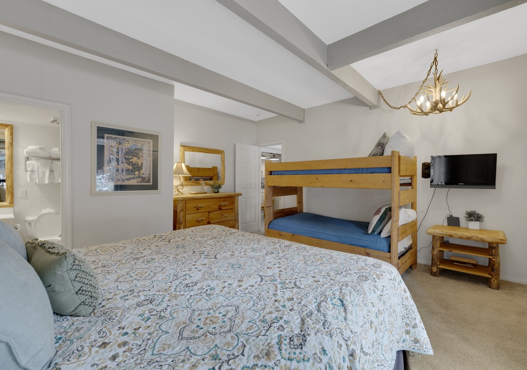 The bedroom is a haven of unique and whimsical decor, featuring a King-sized bed cocooned in sumptuous bedding. There's also a twin over twin bunk bed for additional sleeping space. The bedroom offers another flat-screen TV and an ensuite bathroom, ensuring your privacy and convenience. Should you need even more sleeping accommodations, a Queen sofa sleeper in the living room awaits. After a day of skiing through pristine powder or exploring the myriad of nearby trails and wildflowers, a hot shower or relaxing bath is just the thing to rejuvenate.