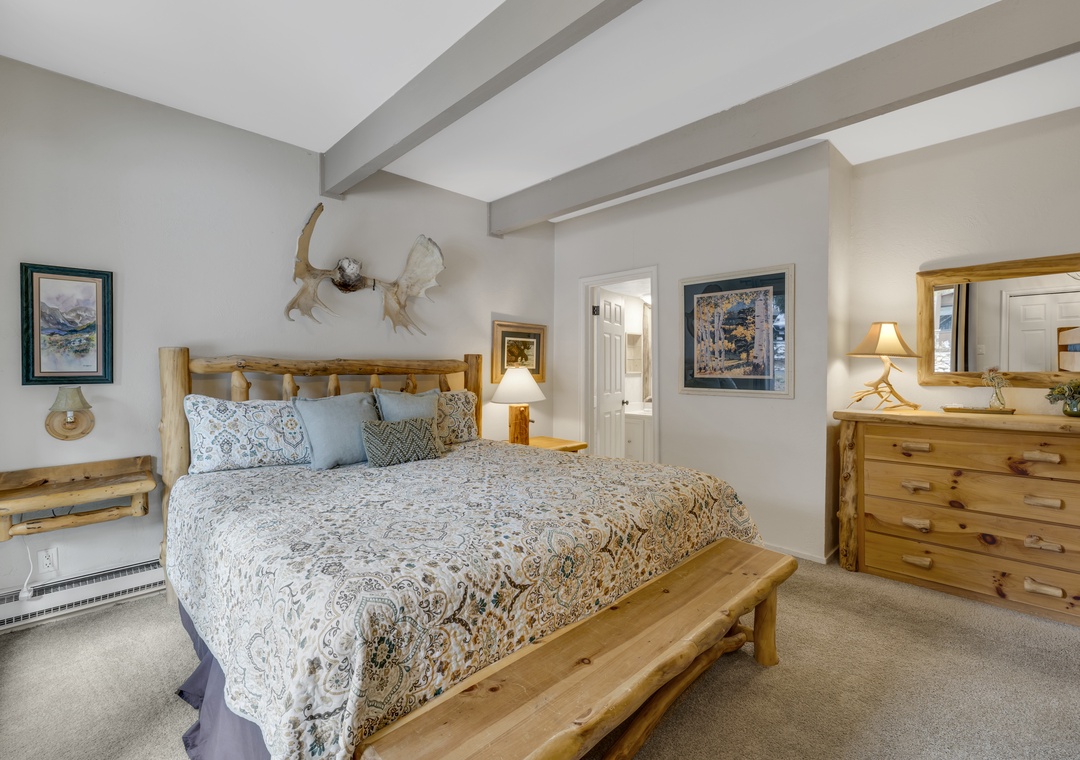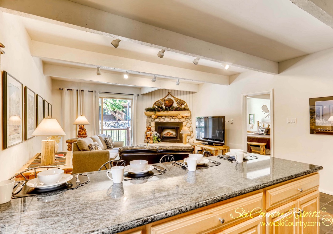 Inside, this cozy yet spacious one-bedroom, two-bath condominium welcomes you with an open layout and rustic beam ceilings that create a warm and inviting atmosphere. The living room beckons you to unwind on its generous couch and loveseat, the perfect spot to savor your favorite movie on the expansive flat-screen TV. But if curling up with a good book is more your style, fear not; this open living space has all the comfort you need, especially beside the cozy rock electric fireplace.