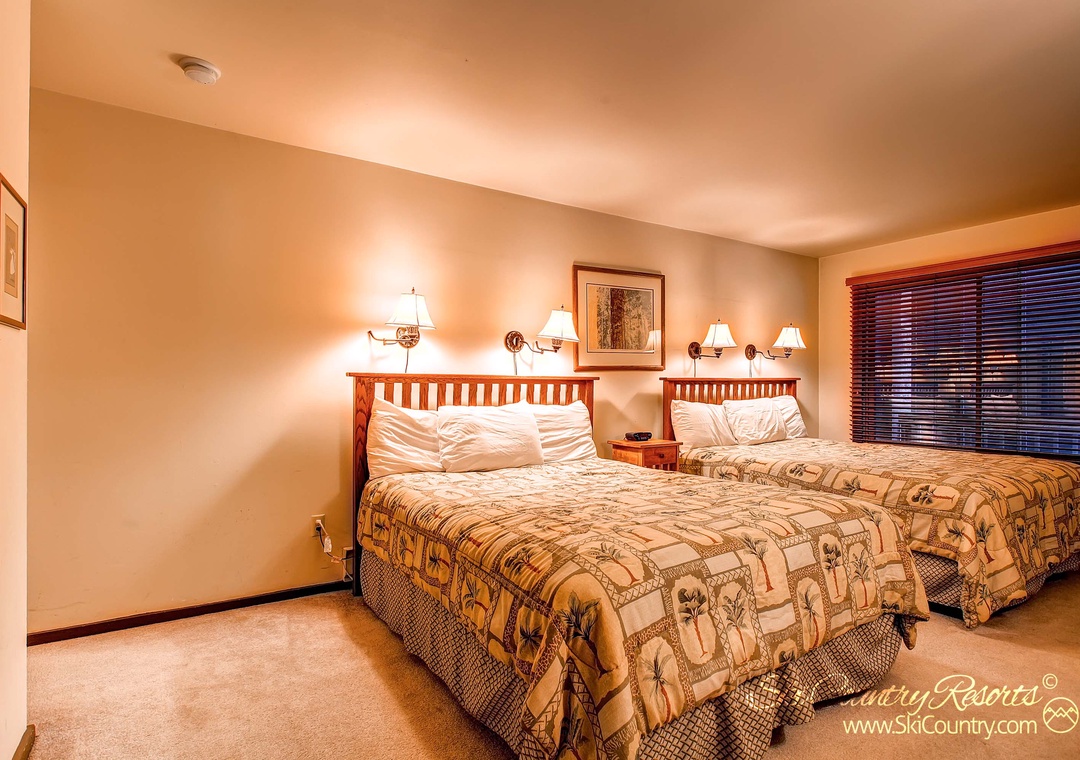 The living room area has a wood burning fireplace as well as two couches that allow you to relax while watching a Blu-ray on the 40” flat screen TV. When it comes to sleeping, this 978 square foot unit can sleep up to six people between the hotel style bedroom, and the Queen sofa sleeper. The bedroom features a TV, mini fridge, coffee maker, closet and dresser for storage and two Queen beds.