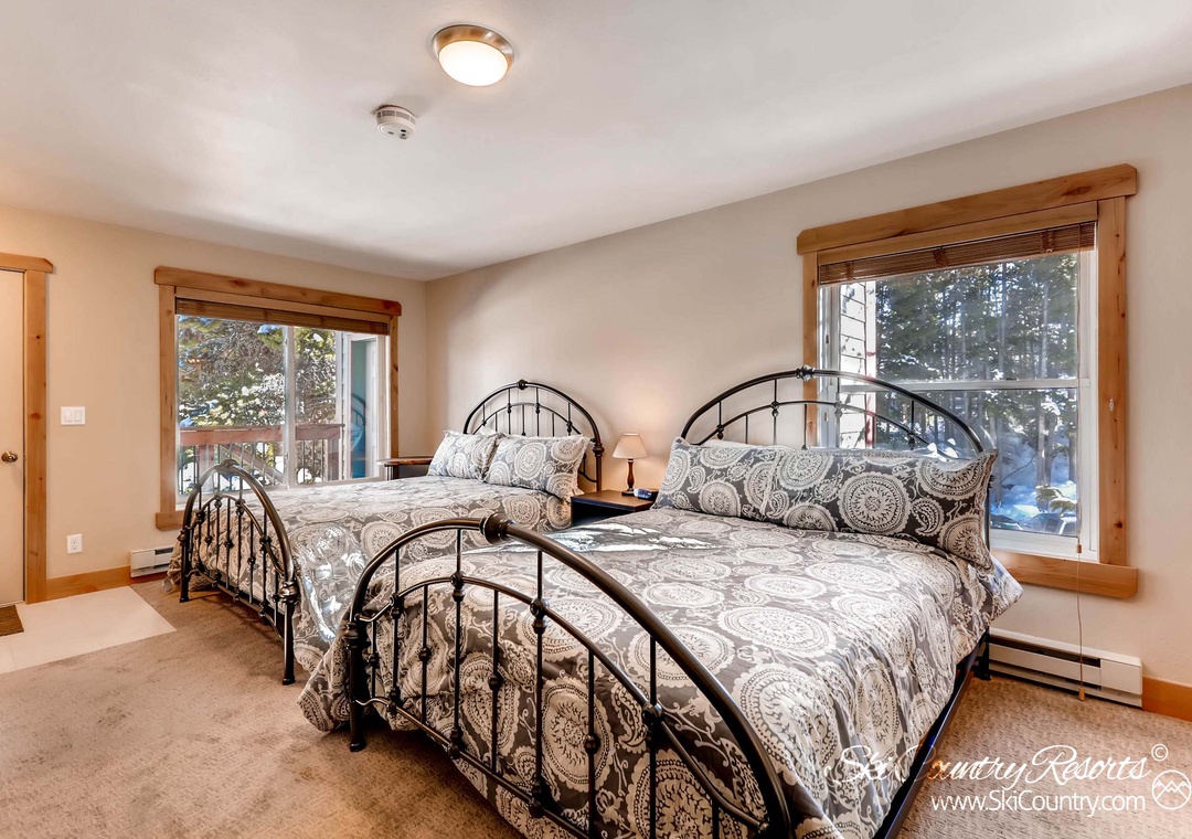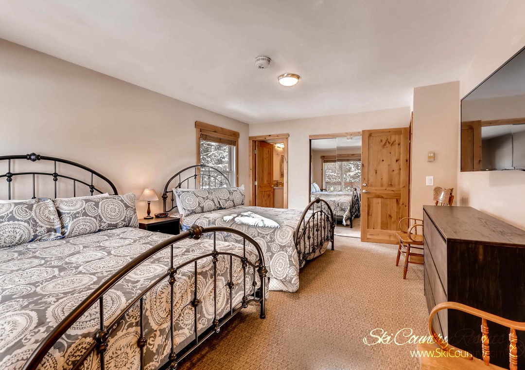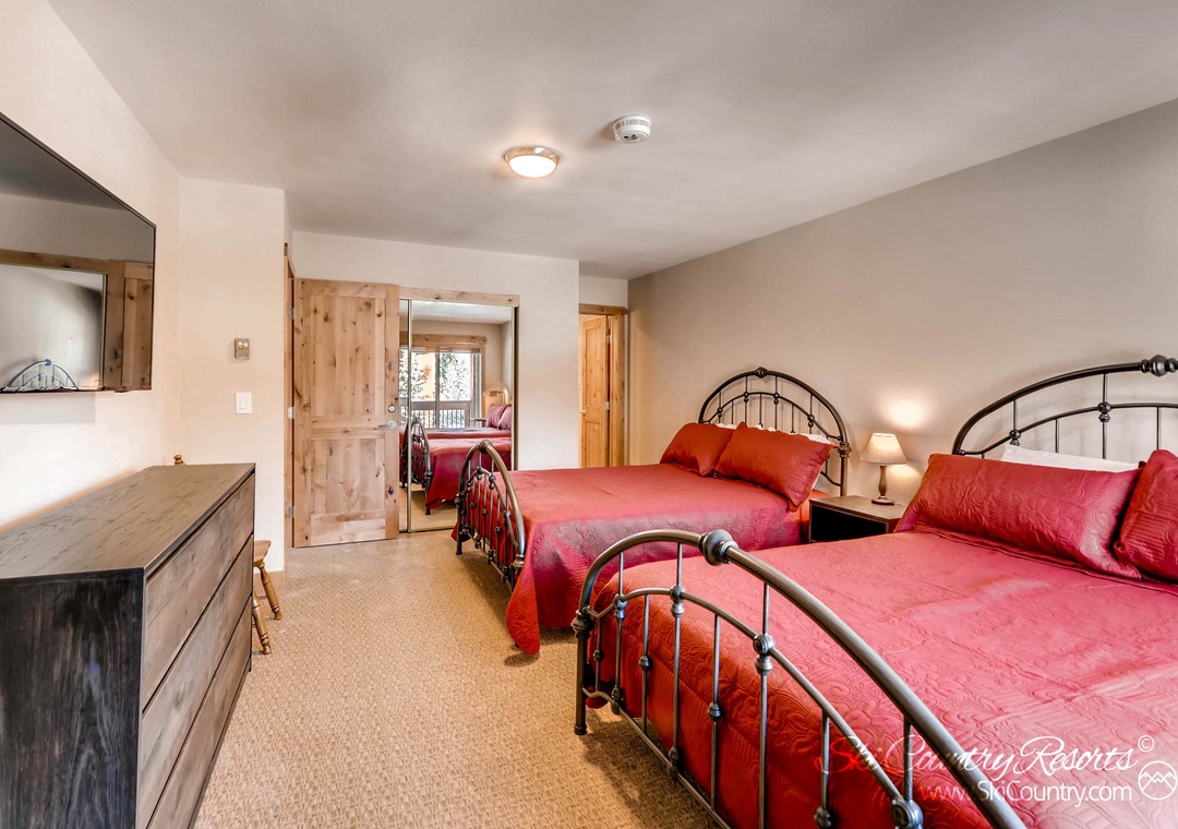 In the evenings, unwind in the living room's embrace, where a comforting gas fireplace beckons you to sink into the plush sectional couch. Let the flat screen TV entertain you, creating cherished moments with your loved ones. Each bedroom also comes equipped with its own flat screen TV and offers 2 Queen Beds each, as well as mini fridge and coffee maker, ensuring convenience and comfort throughout your stay. Ample storage space in the closets and dressers keeps your belongings organized and clutter-free.