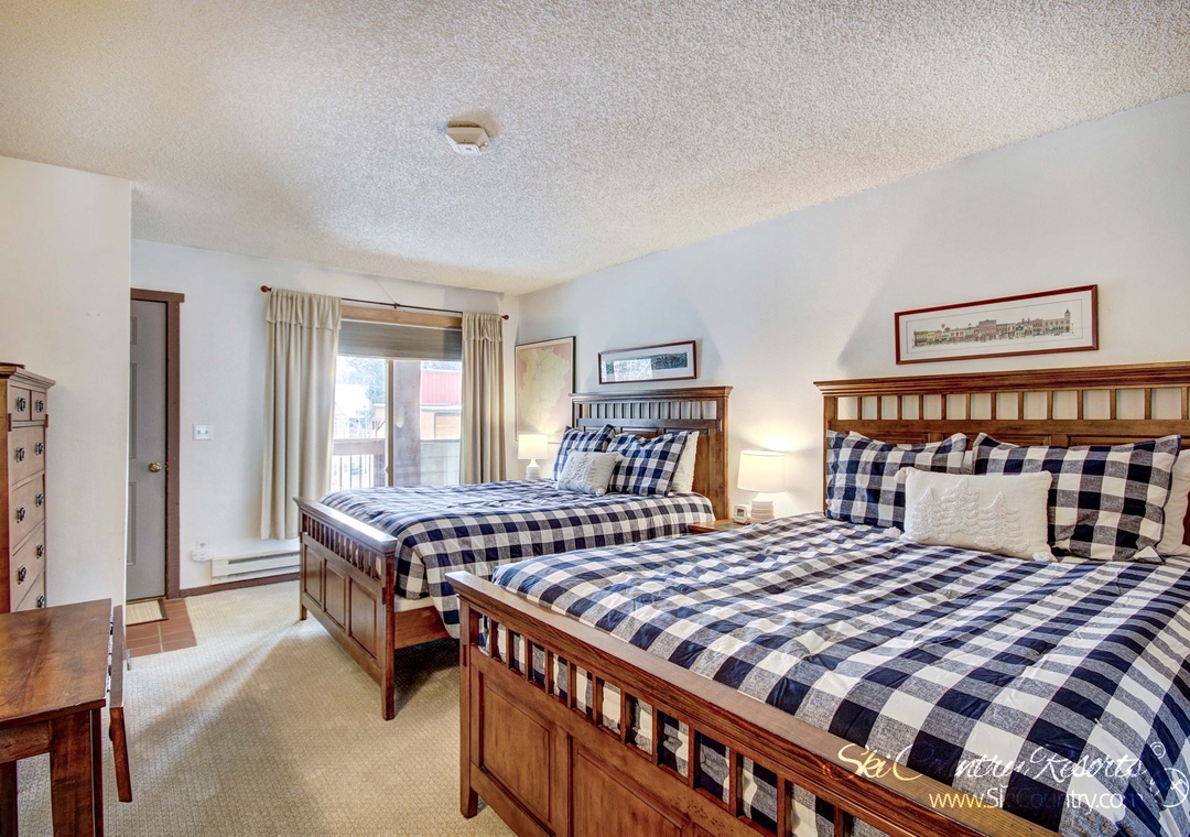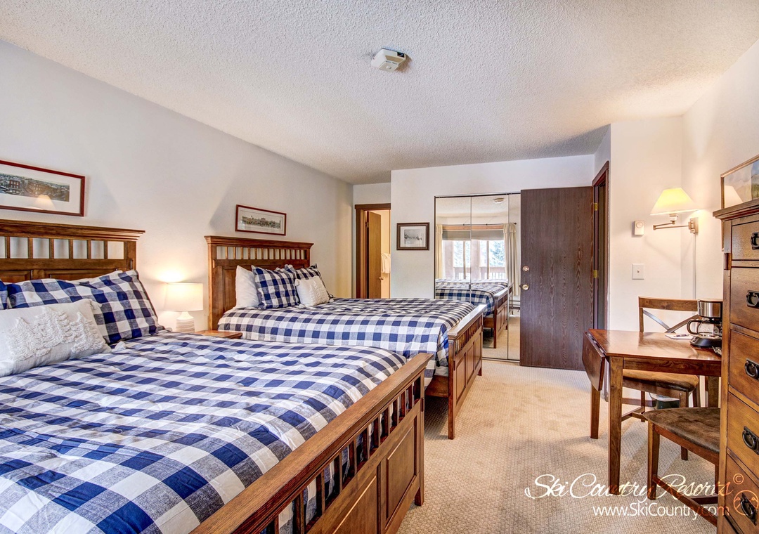 After your day's adventures, unwind in the cozy living room, adorned with a comforting gas fireplace and ample seating on two large couches and additional side chairs. A 32" flat-screen TV stands ready to entertain, presenting your favorite Blu-ray DVDs. Each bedroom is an oasis of comfort, one offering a King Bed and the other 2 Queen Beds and both offering a 26" flat-screen TV, their own newly remodeled bathroom as well as mini-fridge and coffee maker. Ample storage space can be found in each in the form of a full closet and large dresser.