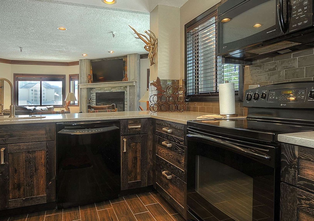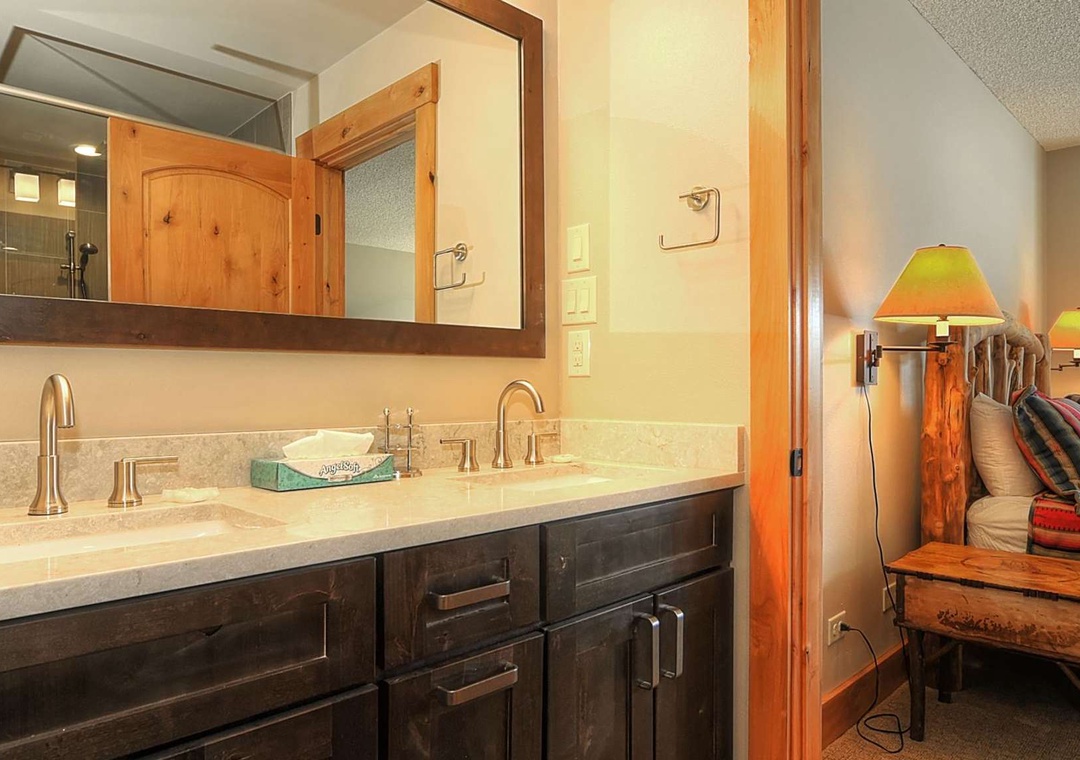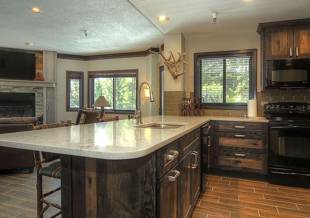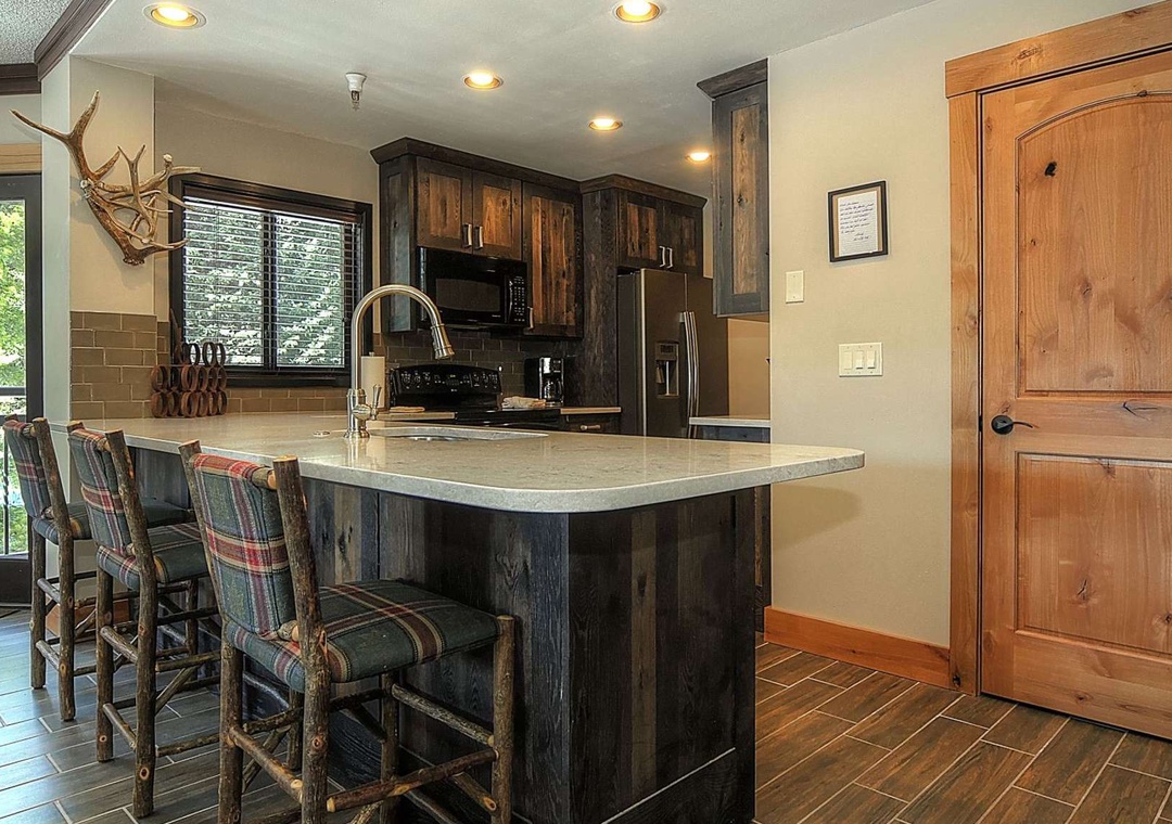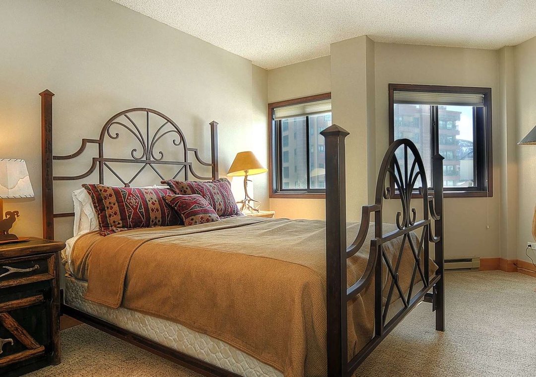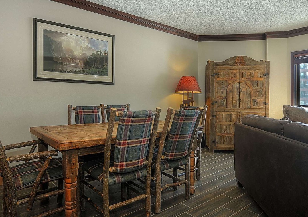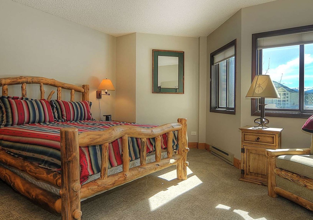 The grand master suite treats you to a sumptuous king bed and captivating views of Peak 9 and the Quicksilver Chairlift. Meanwhile, guests in the other inviting bedrooms can gaze out at the enchanting magic carpet. The spacious double-vanity master bathroom ensures there's plenty of room for those bustling mornings, and the roomy double-glass shower is the perfect finishing touch. But that's not all! This magnificent condo comes fully equipped with all the essentials for a fantastic vacation: central heating, a gourmet kitchen stocked with the finest plateware and cookware, two flat-screen TVs with cable, high-speed wireless internet, and more. After a day on the slopes, you can choose to savor your meals around a stunning wood table in the adjacent dining area, which seats six guests, or indulge in the fun-tastic barstool seating at the kitchen counter.