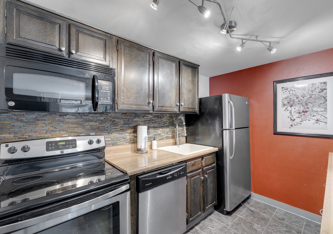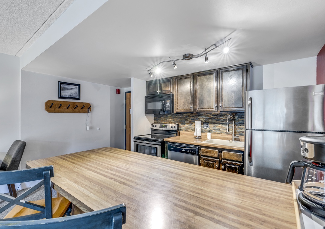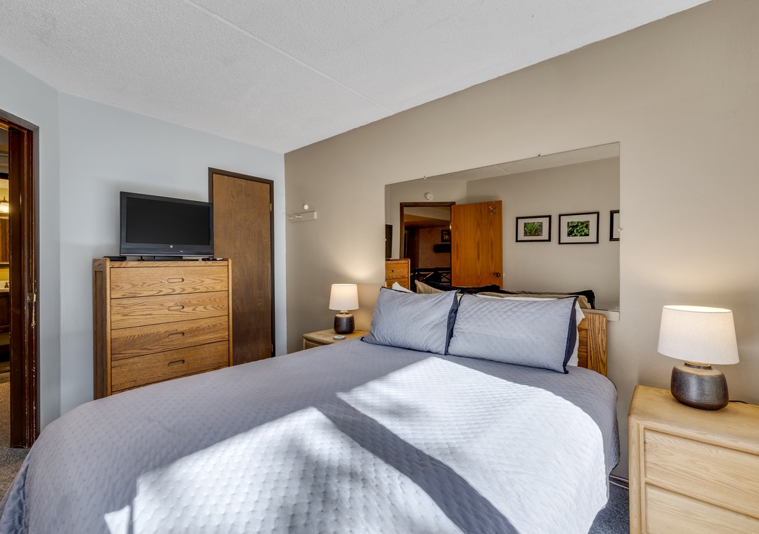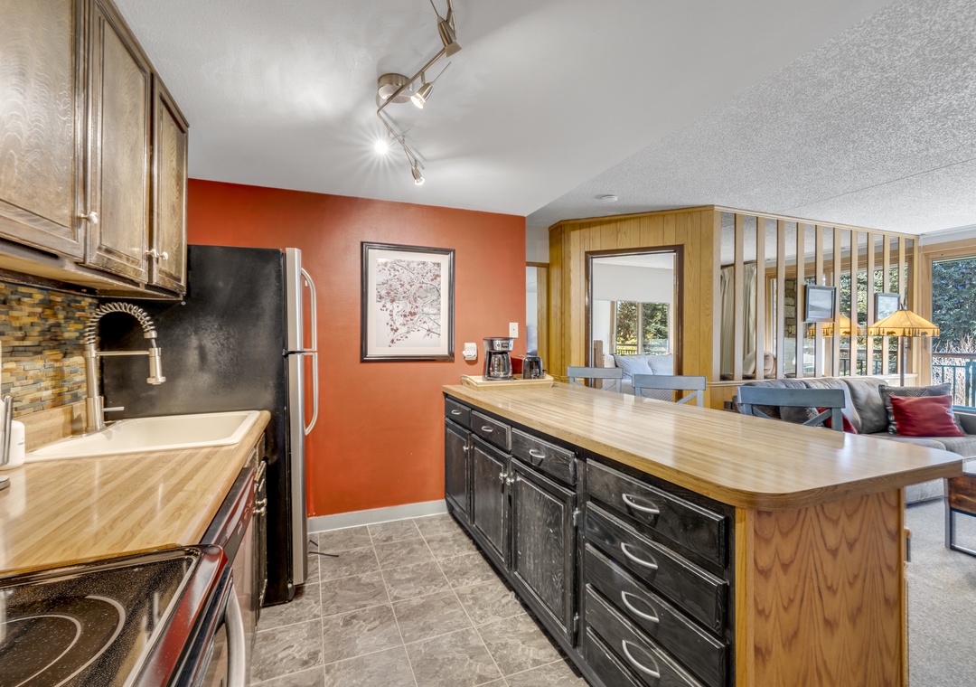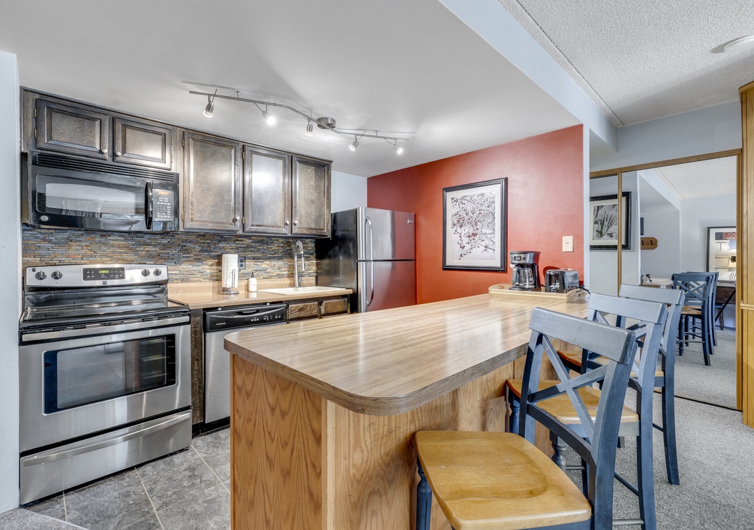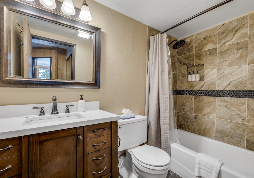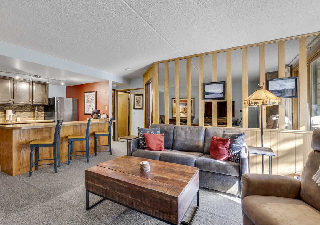 Located on the first floor, this unit combines the perfect blend of mountain appeal and comfort. A fully equipped kitchen makes mealtime easy for families and groups alike. The recently remodeled bathroom allowing you to prep for your day of adventures with ease. A large living room TV to enjoy all your favorite movies and shows. Finish your day by cozying up to the stunning fireplace, a perfect end after a full day of activities.