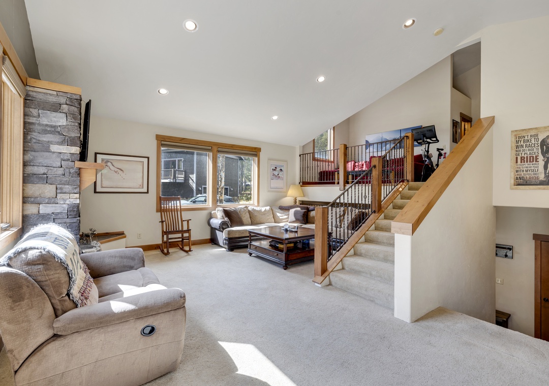 The interior features ample room for the whole family. A large kitchen and dining area makes mealtime easy and enjoyable. The master bedroom with attached bathroom has a large and spacious bathtub and separate shower, as well as a walk-in closet for all the storage one could need. A large basement area with additional sleeping space, a great place for the kids to unwind. The upstairs boasts an additional common area to relax. Additionally, you can end your day of skiing or adventures next to the cozy fireplace in the oversized living room.