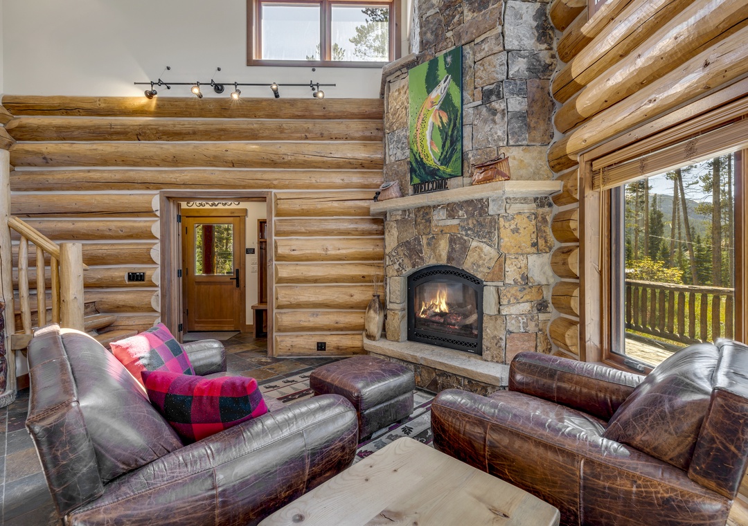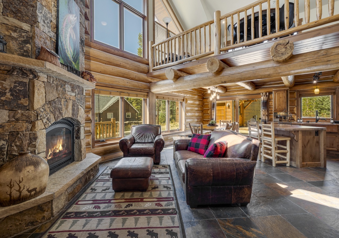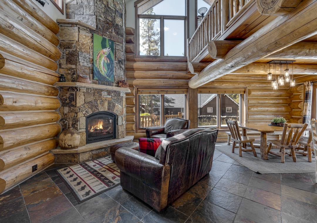 The primary home offers a spacious living room and kitchen area, with plenty of room for the whole family. The open layout with a full dining area and kitchen island provides an abundance of seating to enjoy meals and create memories. An additional common area in the upstairs provides plenty of space to game, laugh and relax. On the main floor, you will find two of the bedrooms, including the bunk bedroom that kids are sure to love. Finally, end your day cozying up to the stunning fireplace, a perfect finale to a day of skiing or adventuring.
