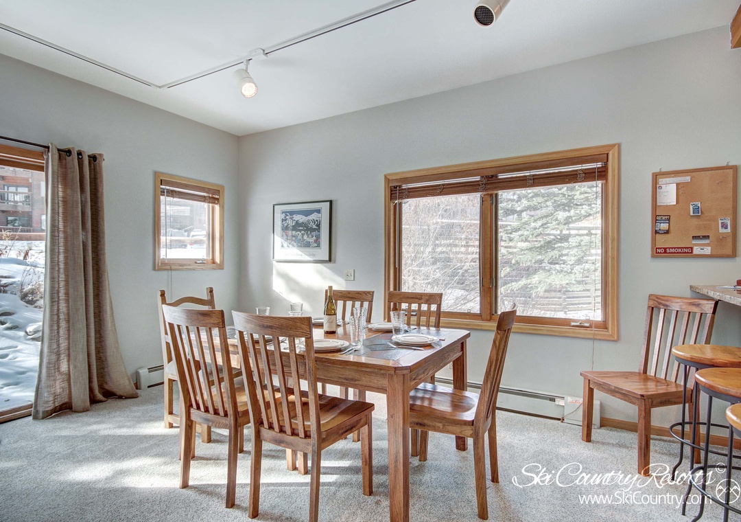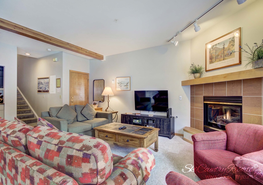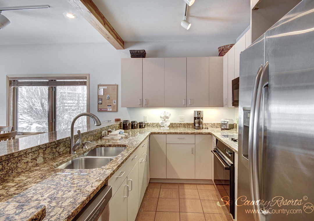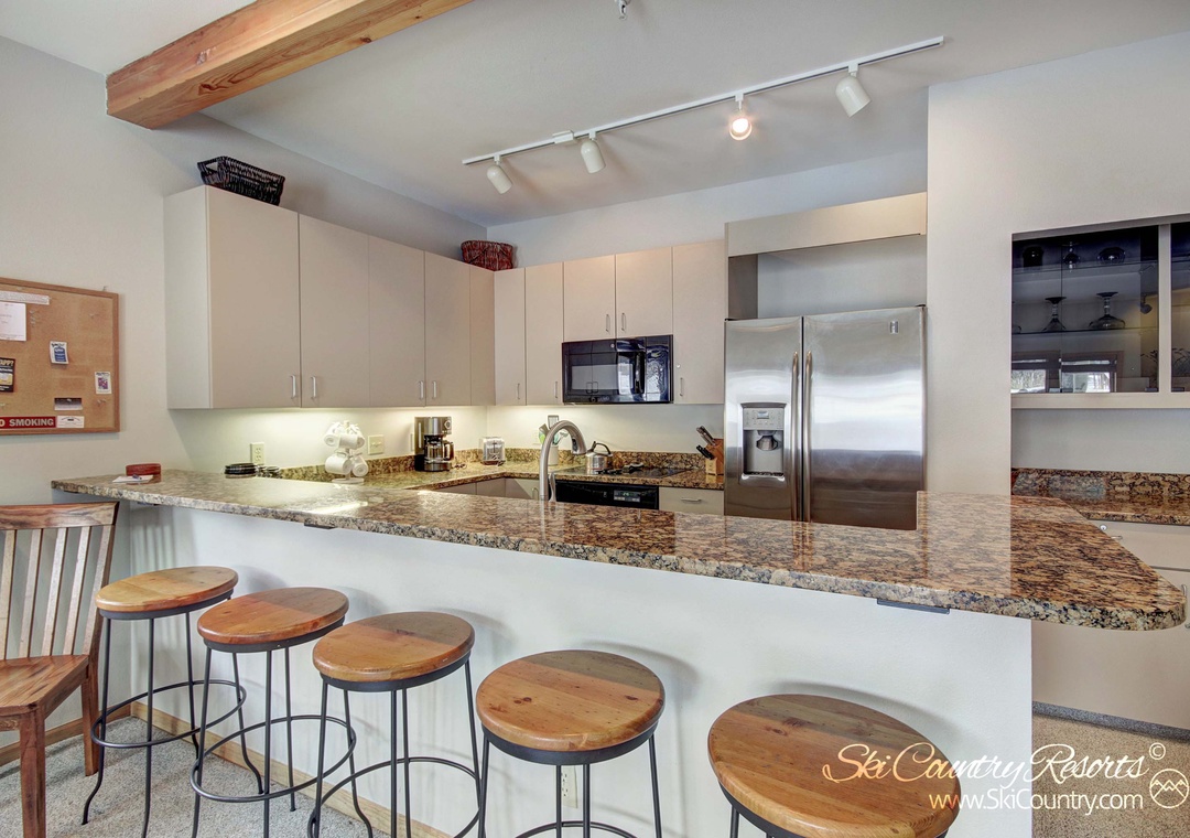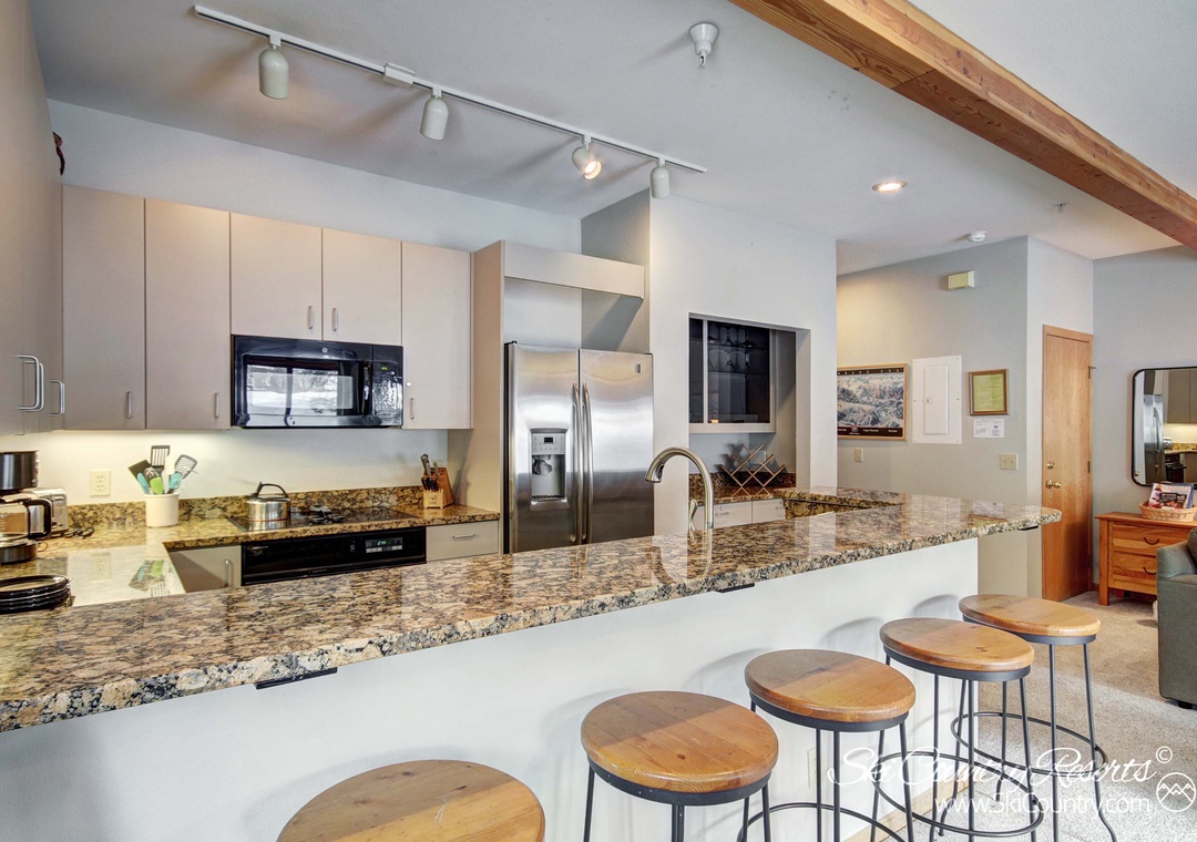 Whether you’re looking for a longer stay or just a weekend escape, this sunny two bedroom, two bath property boasts 1100 square feet of living space. On the ground level of the unit, guests can enjoy the warmth of the cozy gas fireplace while lounging about in the living room - with ample seating for all. The neighboring kitchen features modern appliances, granite countertops and all of the cookware/bakeware and flatware/utensils one needs to prepare any type of meal, big or small! And any 'mixologist' will appreciate the kitchen's neighboring Dry Bar area - a perfect place to mix up a batch of après ski cocktails or after dinner aperitifs.
