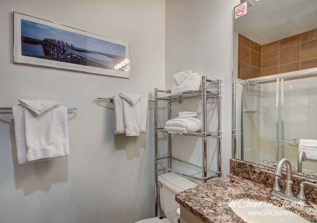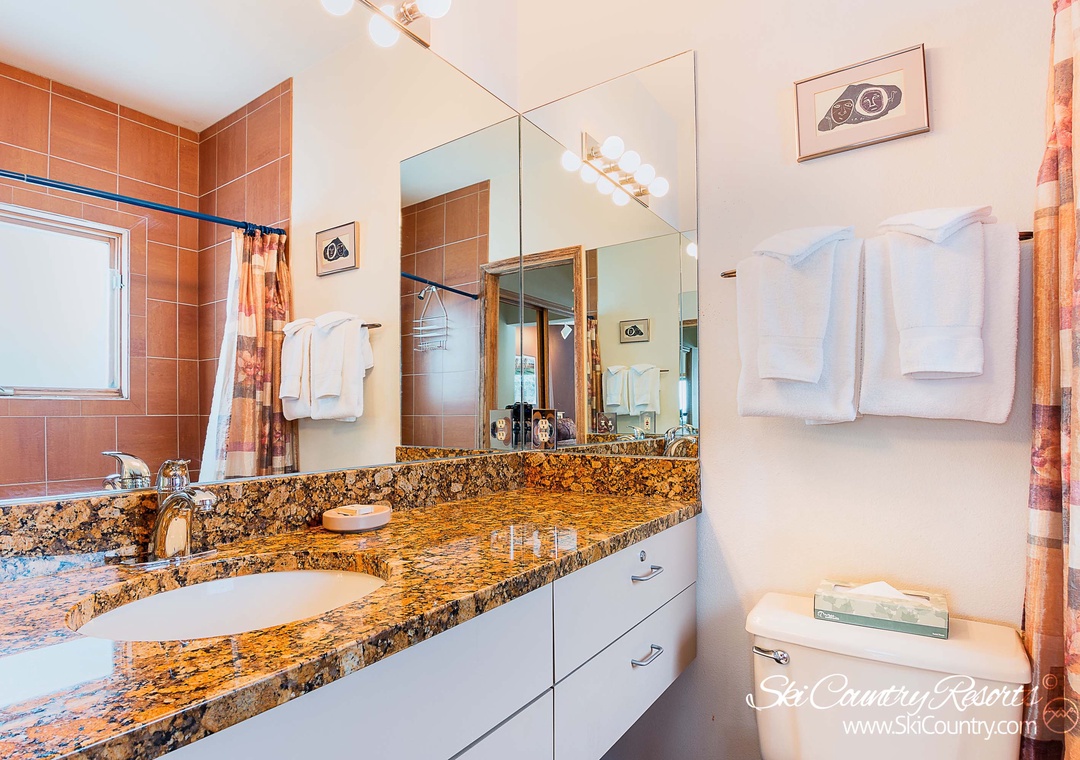 Continue upstairs to find both bedrooms and bathrooms. The spacious master suite offers a large, King sized bed, flatscreen TV and abundant dresser drawer storage for clothes and gear. The master bedroom's private ensuite bathroom, with generous countertop space, offers a jetted tub/shower combination and wraparound mirrors along its granite countertop vanity space. Next, the second bedroom offers two Twin sized beds and another flatscreen TV along with a small, private closet for all storage needs. Across the hall, a second full bathroom with single sink and granite countertop, houses a shower/tub combination and second toilet. For any laundry needs during your stay, this home provides a private stackable washer/dryer comb.