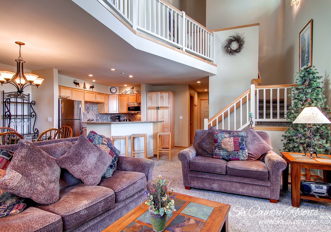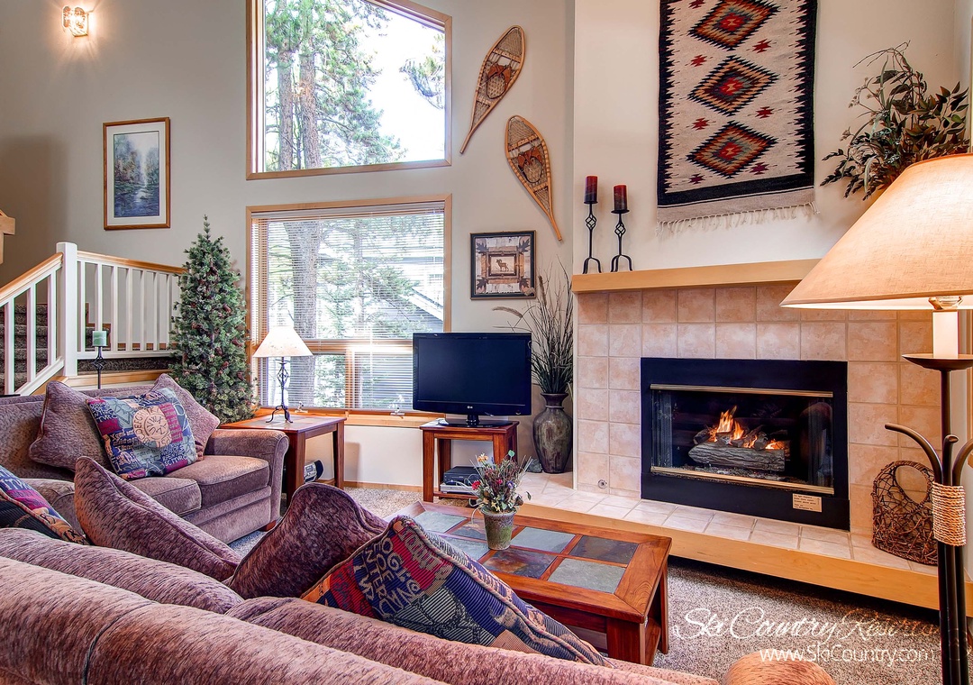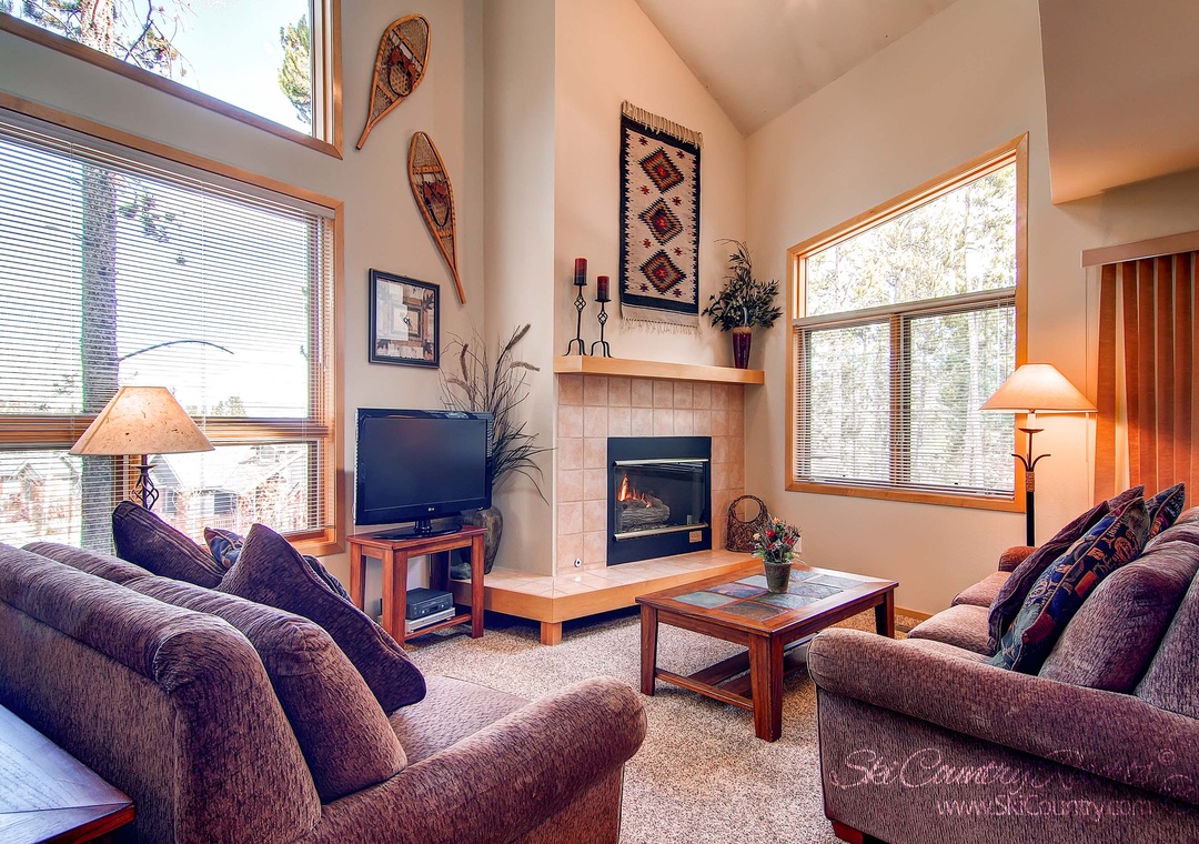 As you step inside, you'll be instantly captivated by the distinctive ski-inspired decor that infuses warmth and character into every corner of this 1,740-square-foot tri-level townhome. The open design welcomes you with a living room that centers around a crackling gas fireplace, a flat-screen TV complete with a DVD player, and sumptuous seating on plush couches. Large windows bathe the space in natural light, creating an inviting ambiance that's perfect for unwinding after a day of mountain adventures.