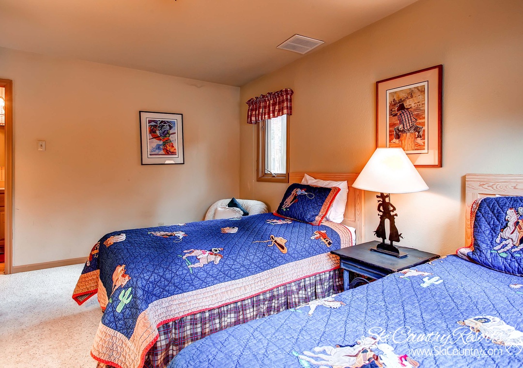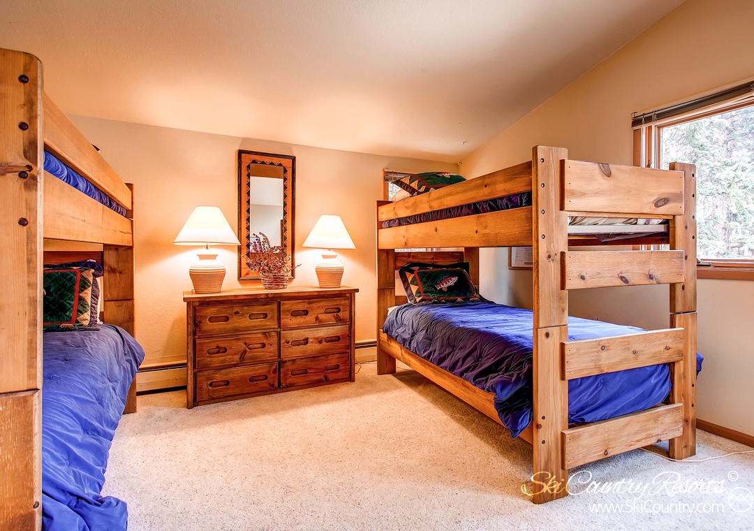 The first bedroom boasts log furniture and mountain-inspired decor and offers a King bed, side chair, dresser and TV. The second bedroom follows a charming ranch theme, furnished with two Twin beds and a cozy oversized chair, perfect for bedtime storytelling. The loft area is equipped with two beautiful sets of Bunk beds, each featuring two Twin beds, providing comfortable accommodations for additional guests.