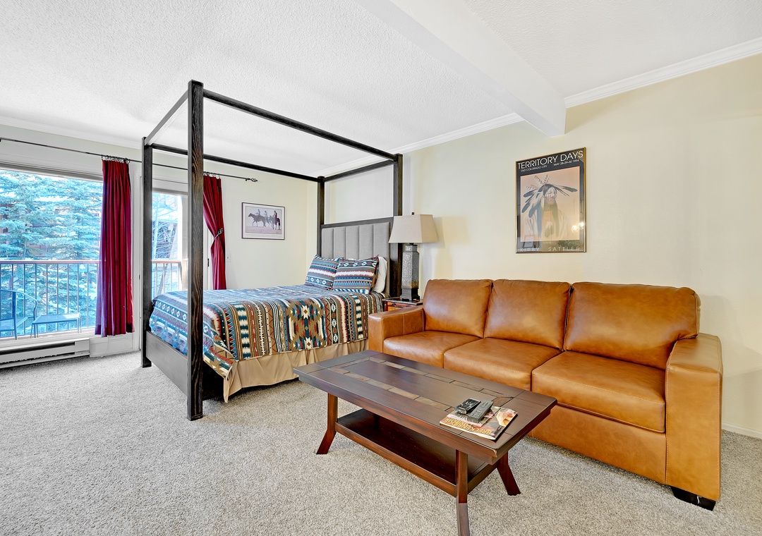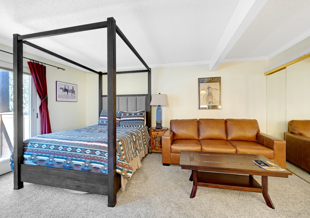 The fully equipped kitchenette has everything you need, including cooking and dining utensils, a refrigerator, stove, oven, microwave, coffee maker, and even a tea kettle for a soothing cup of tea or hot cocoa after a rewarding day on the mountain. Gather around the rustic wood dining table, accommodating up to four people, and savor a delicious home-cooked meal within the comforts of your own unit. In case you need additional sleeping arrangements, the couch conveniently transforms into a queen-size sofa sleeper, allowing the unit to accommodate up to four guests.