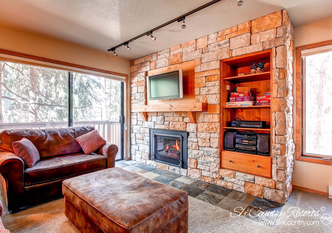 The heart of the home is the captivating living room, centered around a gas fireplace housed within an immense rock wall. Sink into the plush couches bathed in warm sunlight streaming through the large windows as you immerse yourself in your favorite vacation book or indulge in a movie night with the flat screen TV and DVD player.