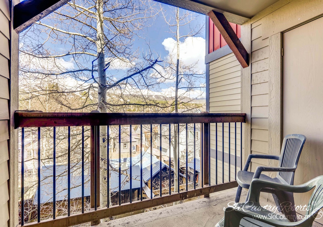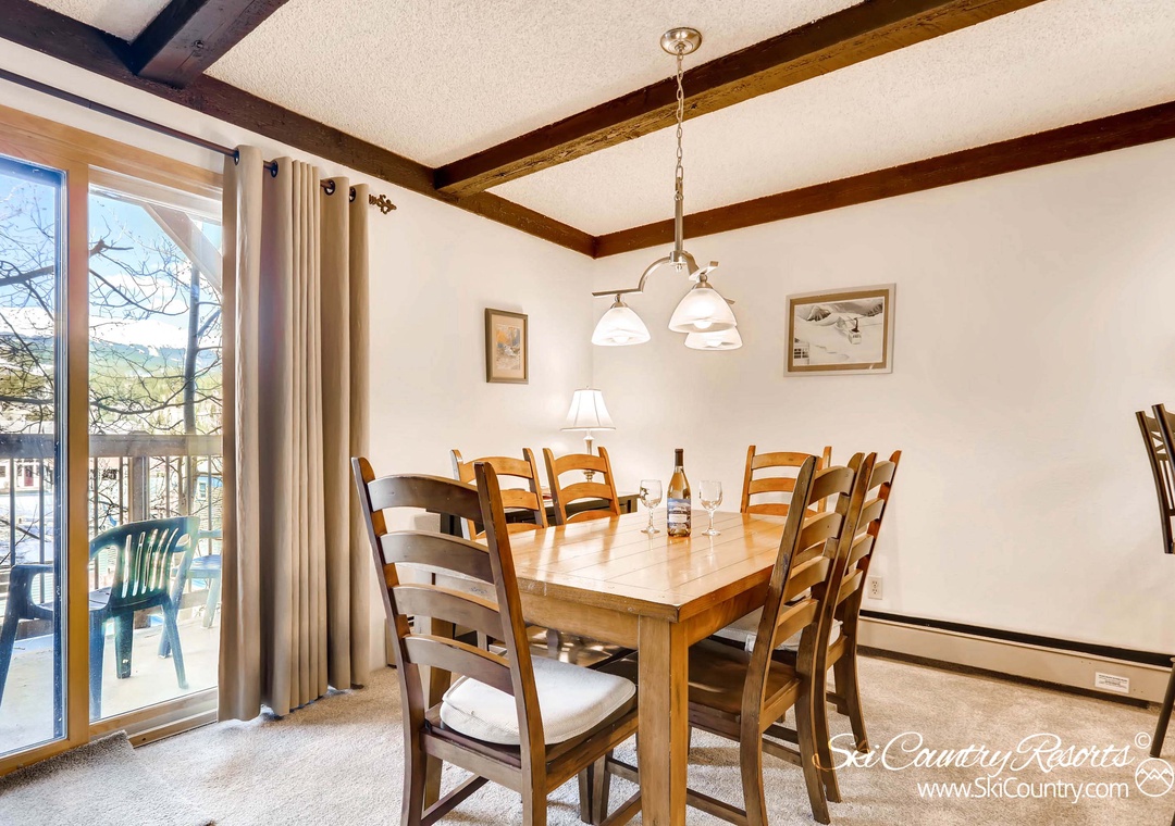 After a day spent exploring Breckenridge's expansive slopes or unique Downtown, cozy up in the living room with a cup of hot cocoa and a good book, sinking into the reclining rocker, loveseat, or plush couch. Feel the warmth emanating from the moss rock gas fireplace as you unwind. Watch your favorite DVDs on the flat-screen TV or simply enjoy quality family time in the open layout of the living room. Step out onto the balcony, just off the living area, and take in the crisp mountain air and breathtaking views and of the surrounding ski area.