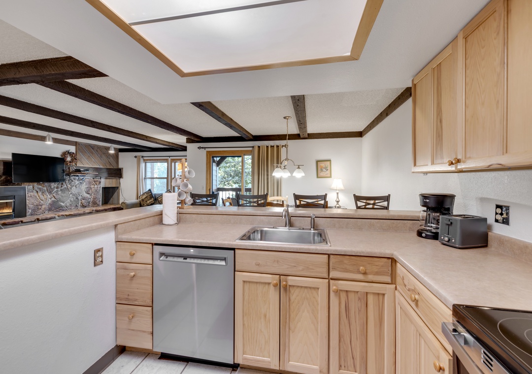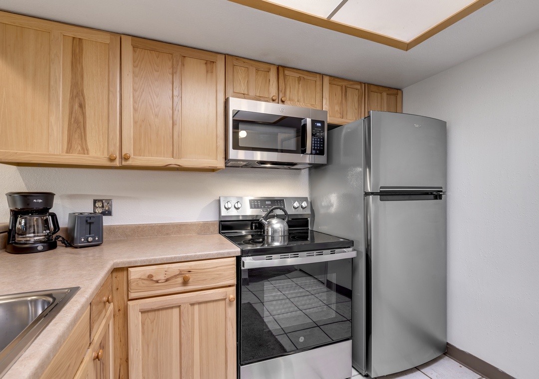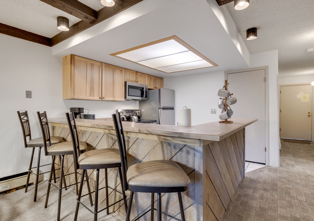 Embracing a mountain rustic decor, this ski-themed condominium offers a cozy home away from home, offering a comfortable and inviting atmosphere throughout your stay. The full kitchen is equipped with all the necessary appliances, including a refrigerator, microwave, stove, oven, toaster, and coffee maker, allowing you to prepare your favorite home-cooked meals with ease. The spacious wood dining table, with seating for six, and high top breakfast bar (with additional seating for four) ensure ample space for enjoyable meals with friends and family.