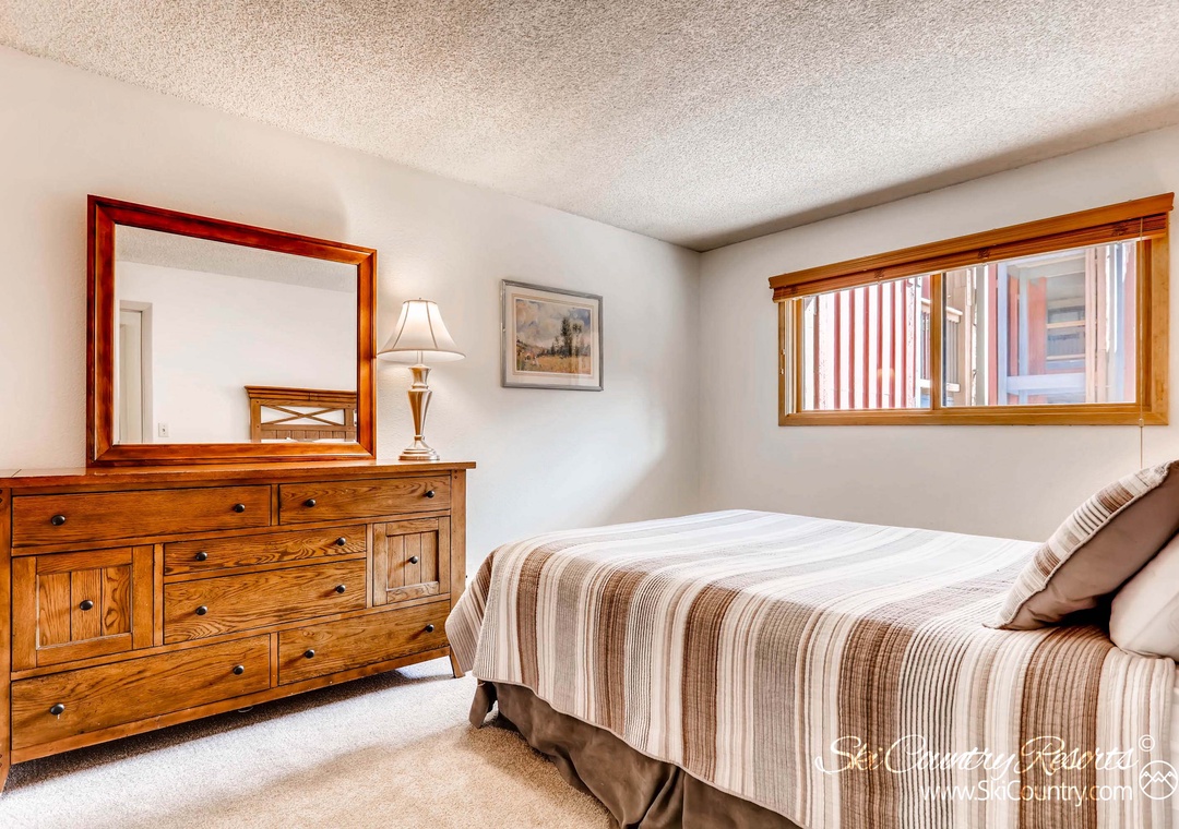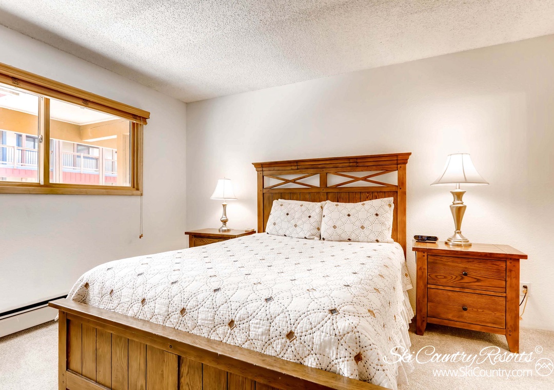 The master bedroom features a comfortable Queen bed adorned with dark wood furnishings and an attached private master bathroom. The second bedroom offers a Queen bed with cozy plaid bedding and dark wood furnishings. If you require additional sleeping space, the Queen sofa sleeper in the living room accommodates two more guests, allowing the unit to comfortably host up to six people.
