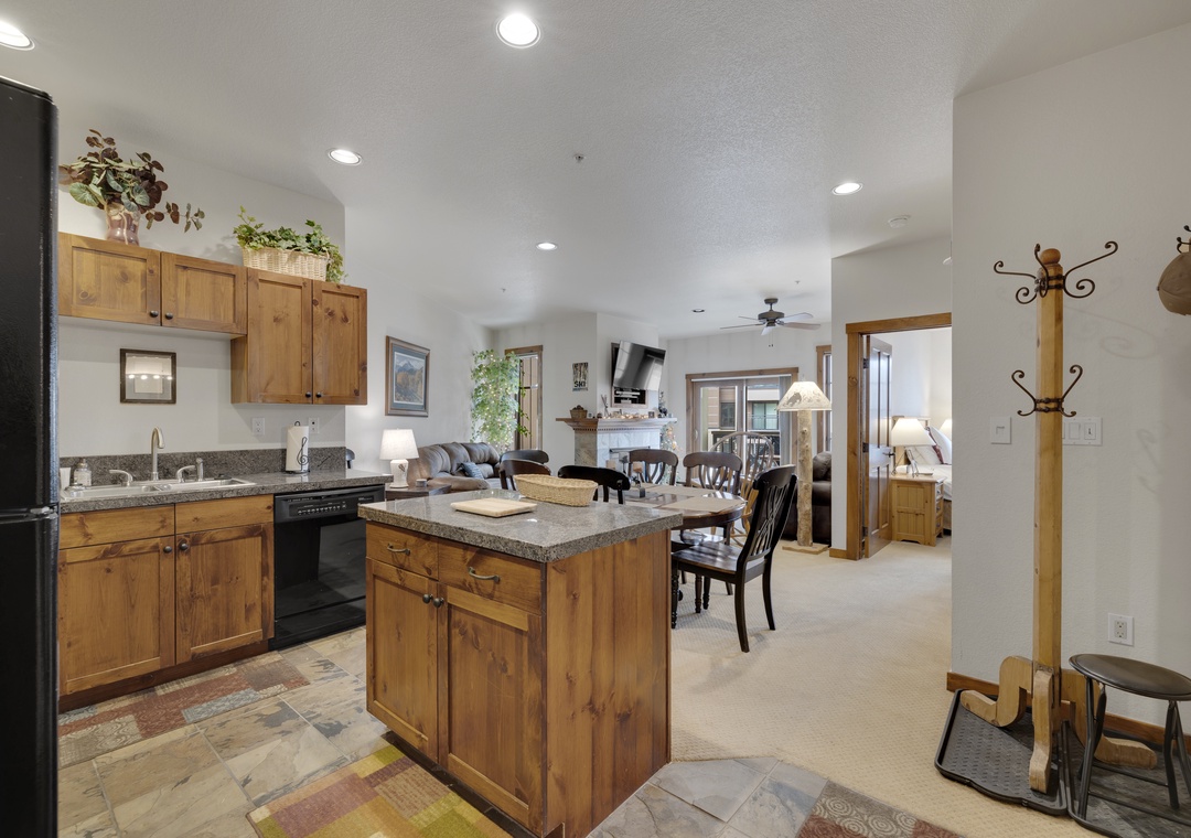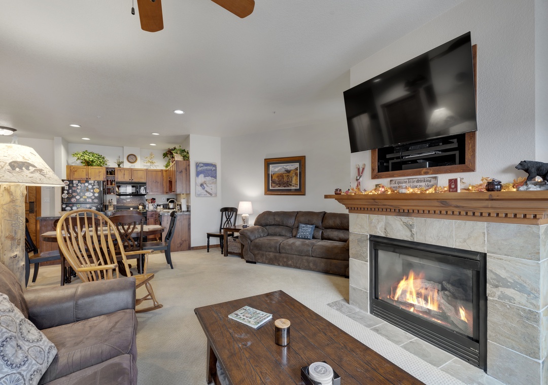 Inside, you will find a beautiful open layout for you and your group. A fully stocked kitchen and dining table makes mealtime effortless. The master bedroom with attached bathroom where you can soak in the jetted tub after a long day of skiing. Enjoy incredible views from the balcony and breathe in the fresh mountain air. Finally, end your day cozied up to the fireplace, a perfect way to end your day of adventures.