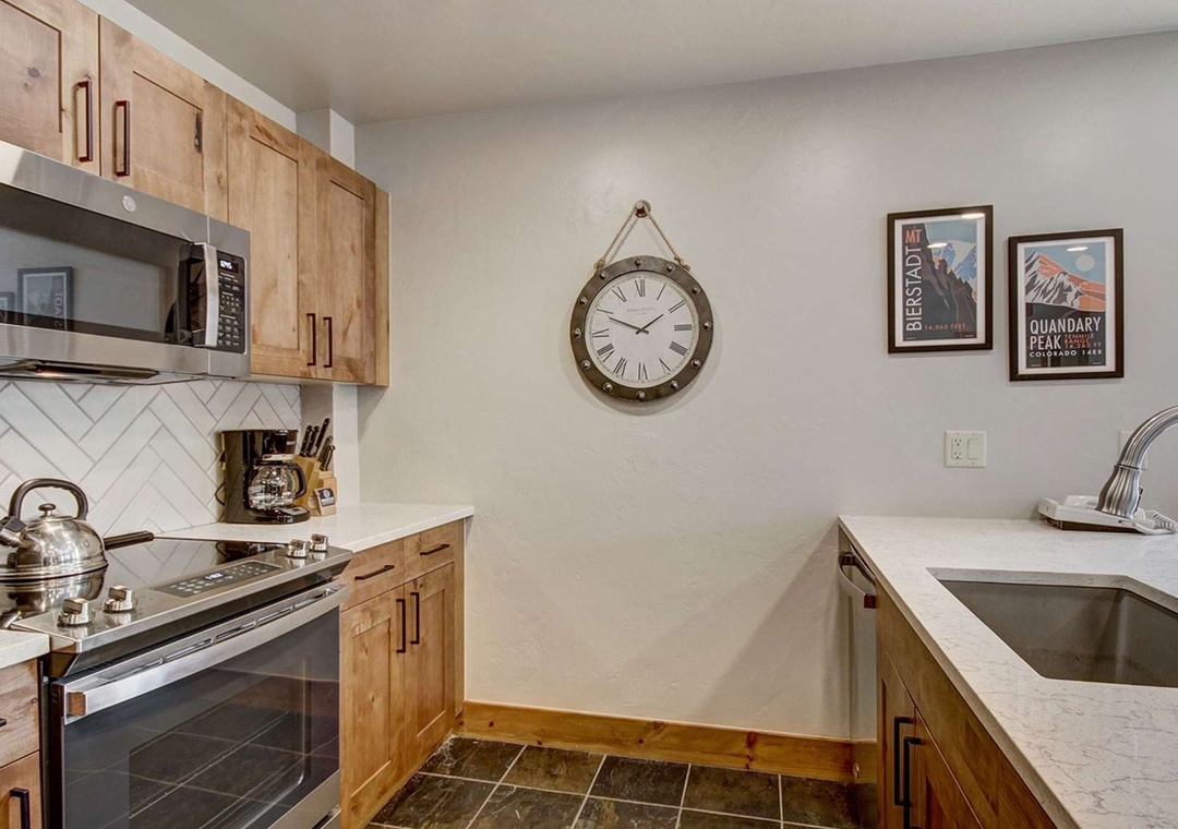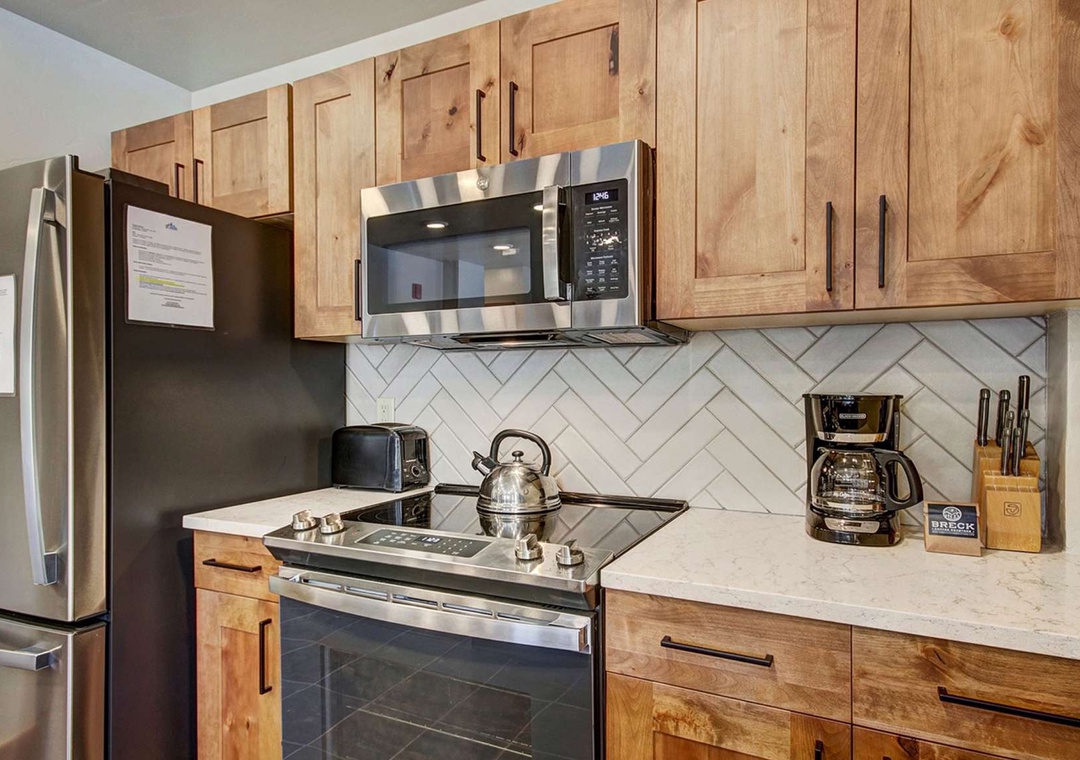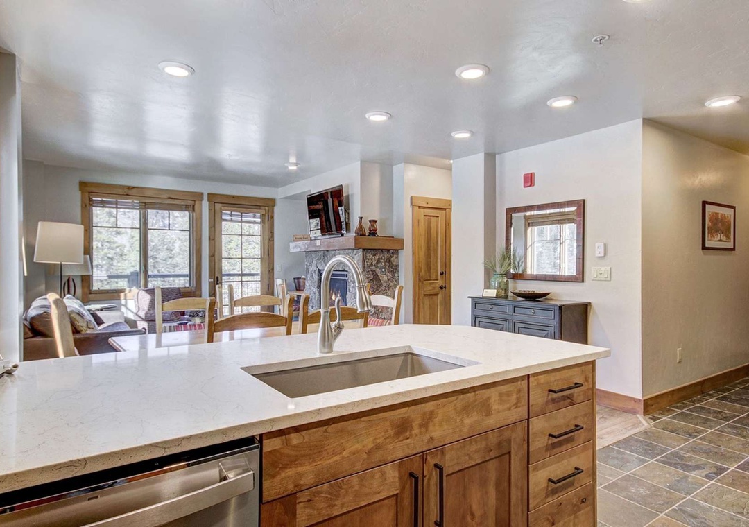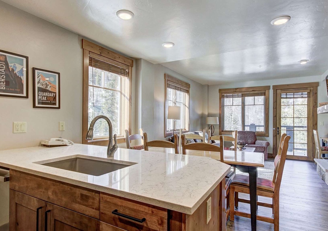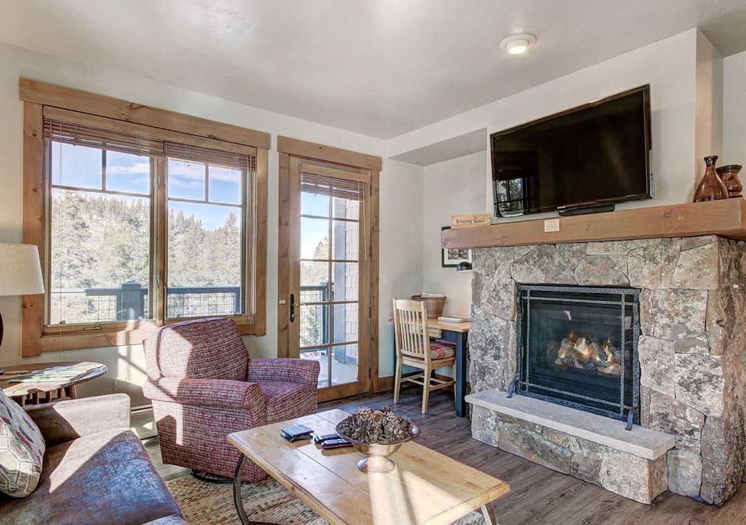 With new floors, cabinets, and quartz counters, this 1025-square-foot condo with a private wrap-around deck is one of the largest units at the resort and only shares one wall with the adjacent unit. Like the resort lobby, our unit features beautiful rustic stonework and wood throughout. It is topped off with quartz in the kitchen. The condo's kitchen comes fully stocked with all of the plateware, utensils, and mixing bowls that you will need to make your stay comfortable; yes, we even have a coffee pot. The kitchen opens up directly into the roomy dining and living areas. From here, guests can enjoy the large flat-screen TV and great views from the private deck, all without leaving the comfort of the unit's gas fireplace.