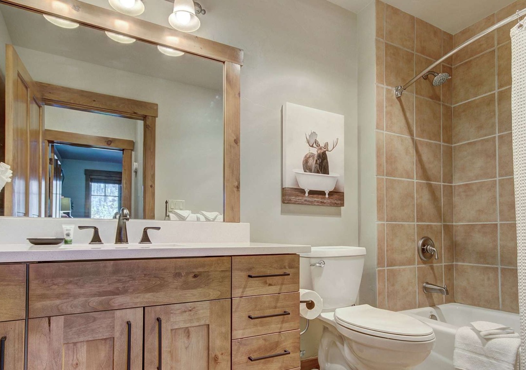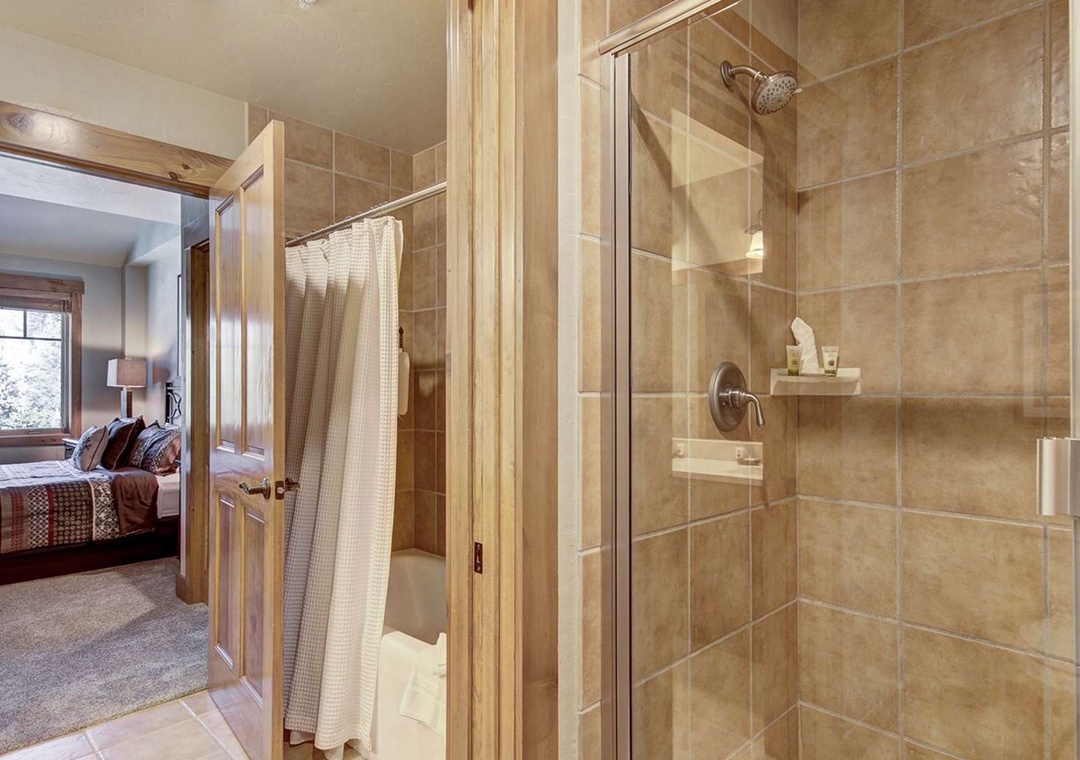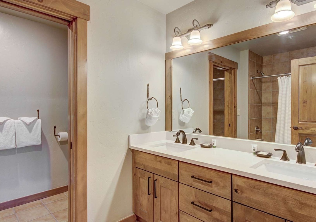 There are two big and well-appointed bedrooms in this unit. The master bedroom features a king bed, a flat-screen TV, and an updated en suite full bathroom. The master spa includes a double vanity, soaking tub, separate shower, and stonework. In the guest bedroom, you will find a queen bed and a third flat-screen TV. The updated guest bathroom is right across the hall from the guest room, and extra sleeping space can be created by utilizing the unit's queen sleeper sofa. Vaulted ceilings in the bedrooms and large windows make this unit bright and open.