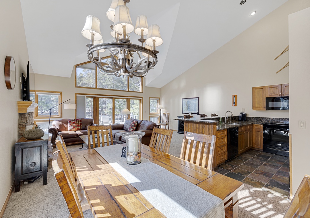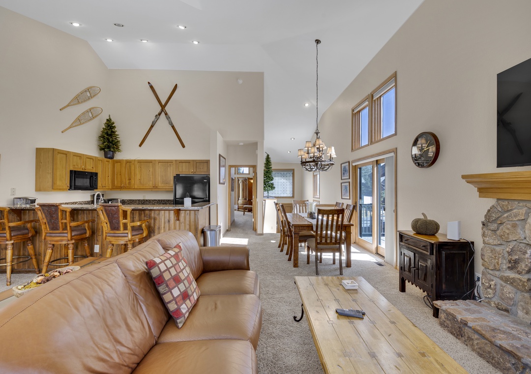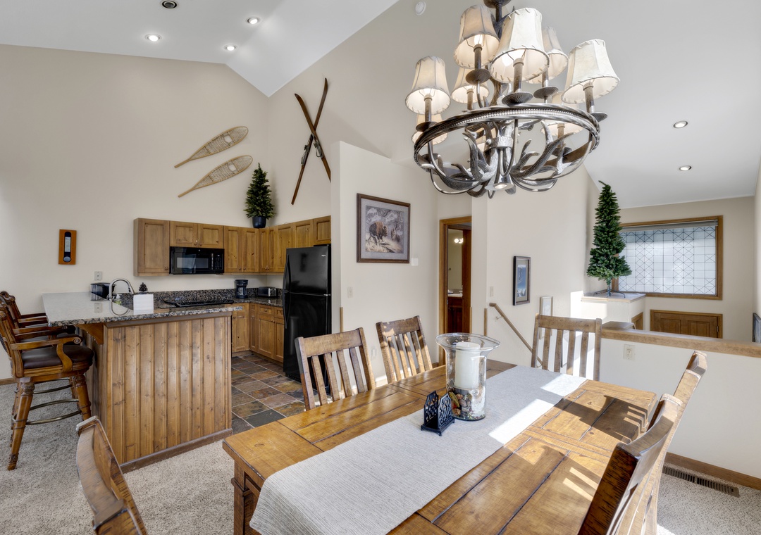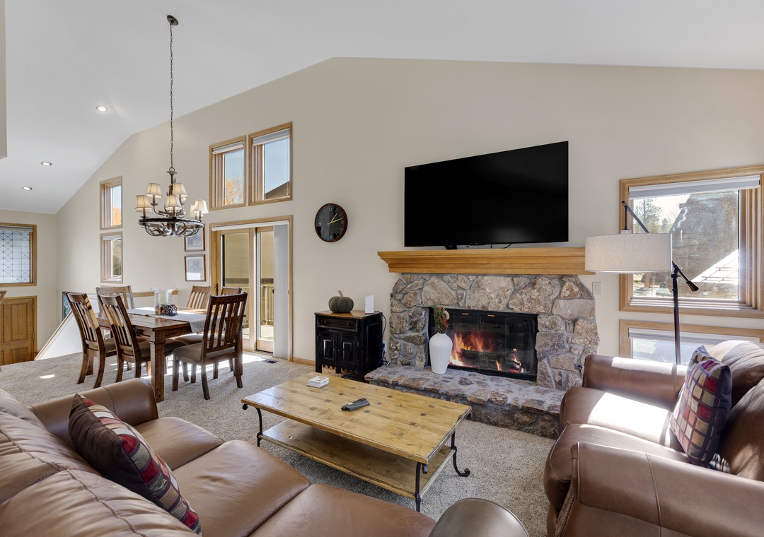 Each bedroom in this three-floor townhome has its own private bathroom, making everyone's stay comfortable. The master bedroom bathroom has a large, jetted tub to relax after a long day. The bunk bedroom, with a triple bunk bed, will make the kids excited for their own space to unwind. The main floor contains an open layout providing an abundance of space for you and your family. A large dining room table making mealtime effortless. Finally, end your day of adventures next to the stunning fireplace, an ideal ending to a day of skiing.