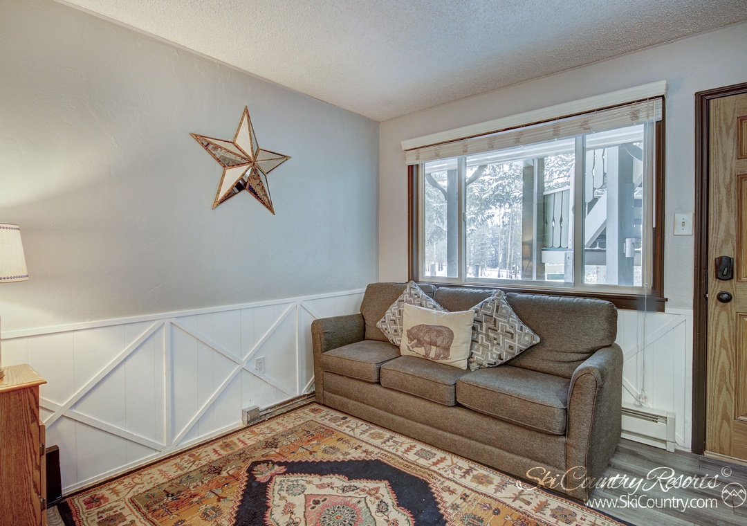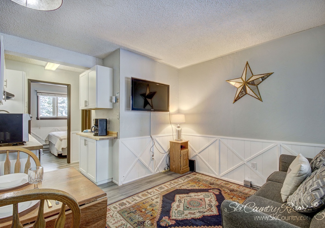 Step into your winter wonderland escape as you walk through the door. The living room greets you with a 22-inch flat-screen TV, perfect for unwinding after a day of exploration, and a plush sofa sleeper. Fresh luxury vinyl flooring, installed in November 2022, spans the entire unit, making it easy to clean up after those snowy adventures.