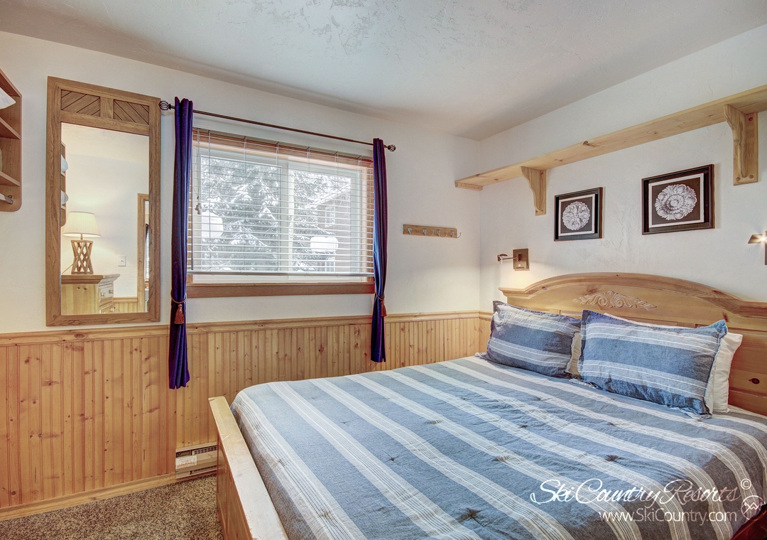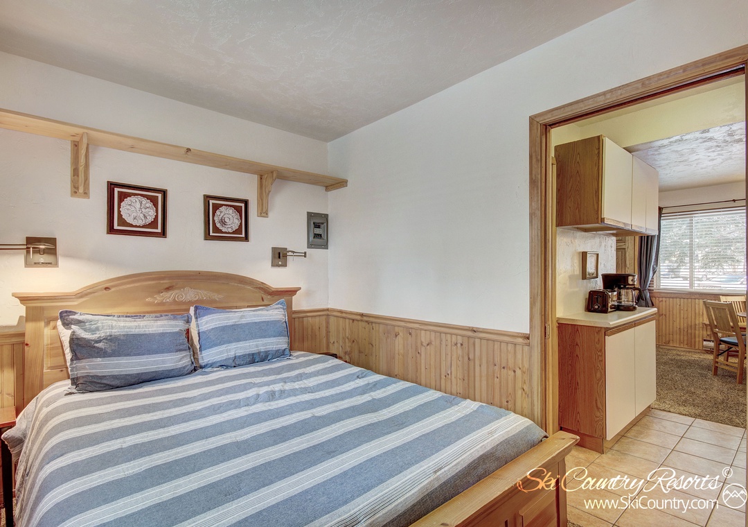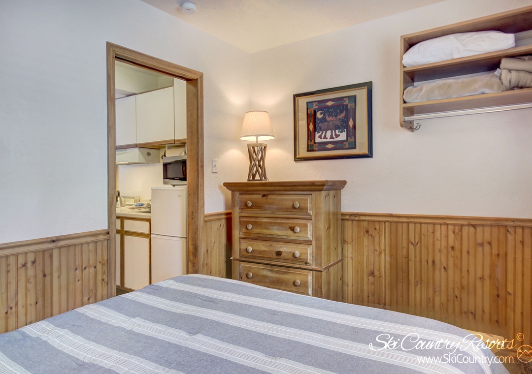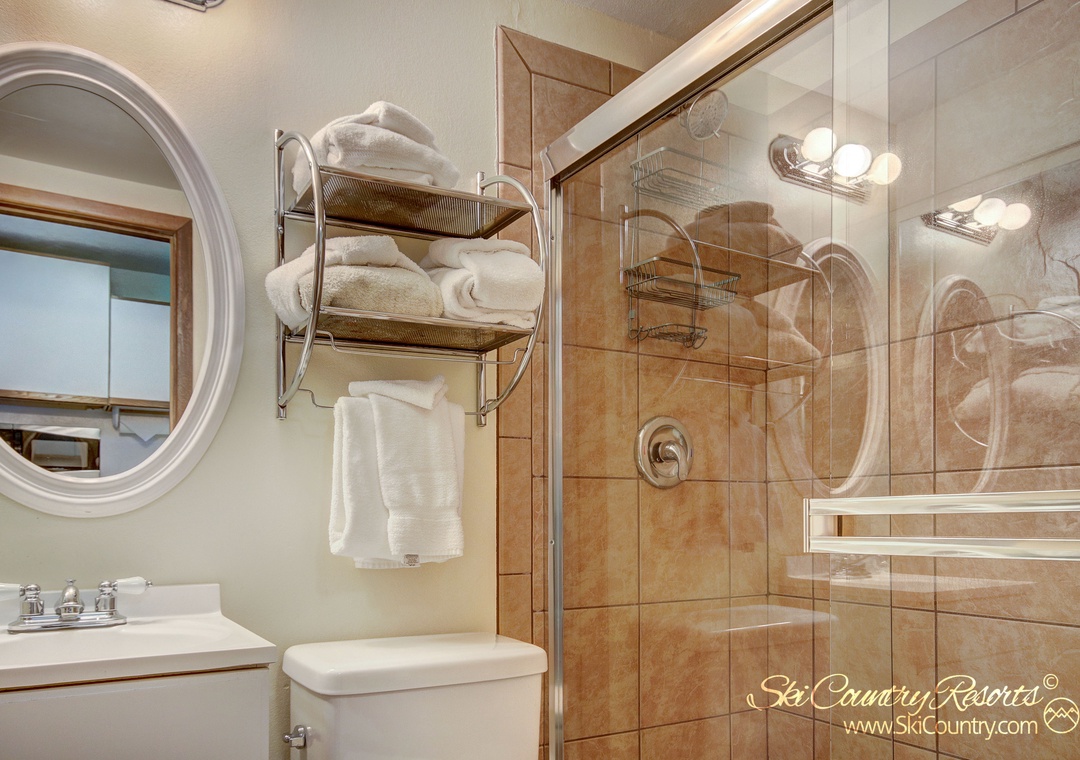 Retreat to the private bedroom where you'll find a Queen bed enveloped in suede bedding. For storage of all your mountain gear, the bedroom is equipped with full-size dresser and closet. Additionally, right outside your front door, a private ski locker is at your disposal for securely storing any bulky ski, snowboard or mountain gear you may have throughout your stay. After a day of mountain exploits, unwind in the recently renovated bathroom, where a sleek stand-up shower framed by glass sliding doors awaits.
