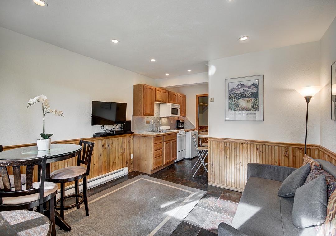 Inside Park Meadows Lodge unit 3C, you'll find stone tile flooring, a contemporary suede sofa, and a brand-new flat-screen TV. The kitchenette is fully stocked with essential utensils and appliances, including a mini-fridge, stove, microwave, toaster, and coffee maker, perfect for preparing meals. The bedroom features rustic wood-paneled walls and a comfortable Queen pillow-top bed, with a sleek walk-in shower in the adjacent bathroom.