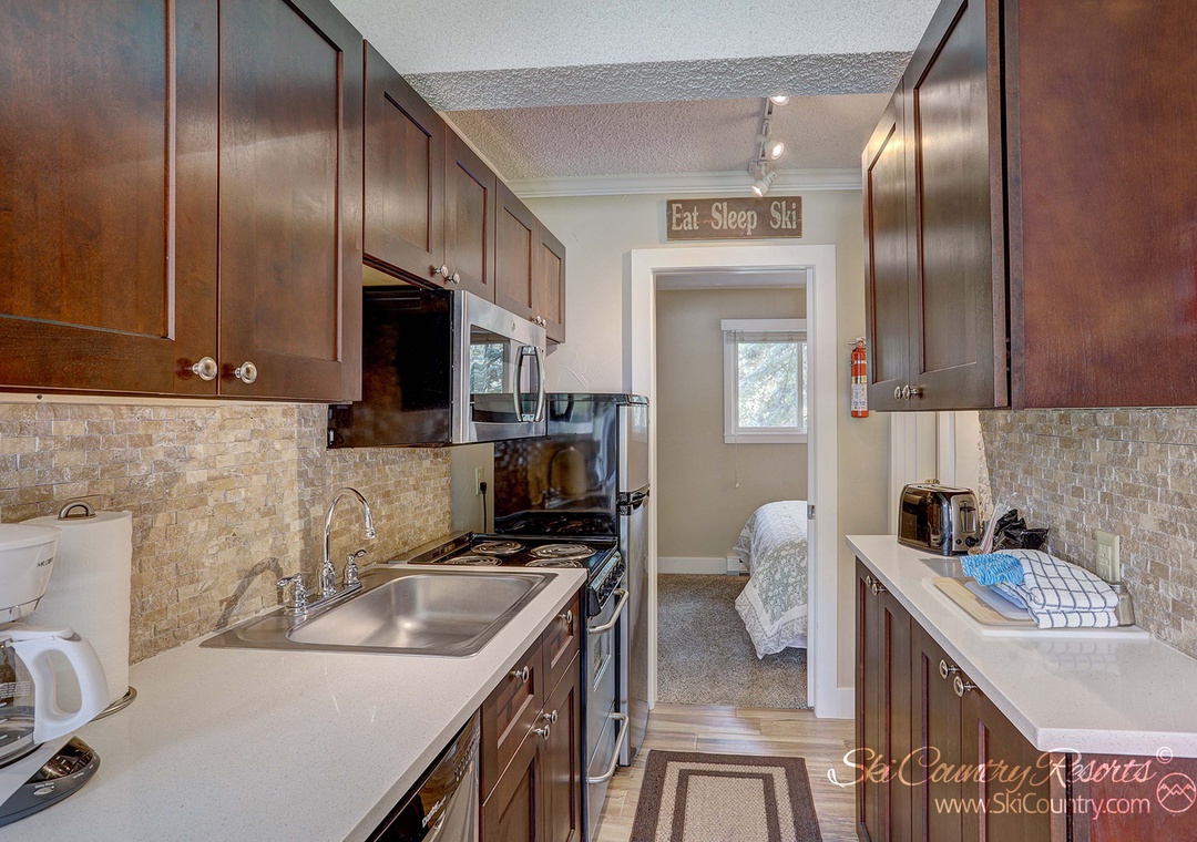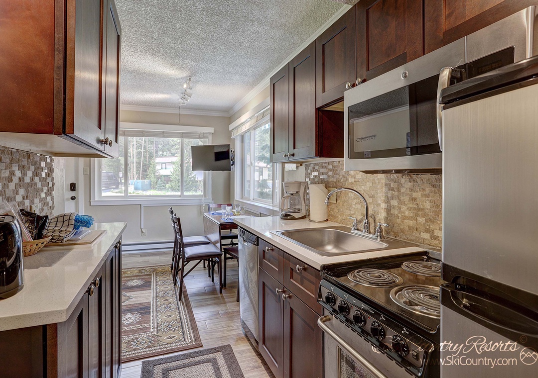 The heart of this condo is its remodeled kitchenette. A culinary haven boasting stunning cherry cabinetry stocked full of all necessary dishware and utensils. Clean white countertops and stacked stone backsplash further complement this stunning space, while stainless steel appliances (including refrigerator, oven/stovetop, microwave and dishwasher) stand ready to assist you in creating your culinary masterpieces.