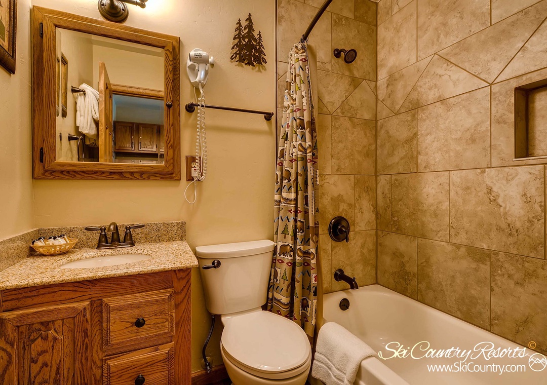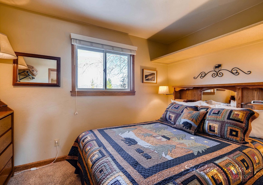 In the bedroom, a Queen Size pillow-top mattress awaits, and a small dresser and clothes rack are ready to store all of your mountain gear. Meanwhile, the recently upgraded bathroom has been outfitted with elegant tiled shower/tub combination and copper shower head and fixtures, adding a touch of luxury to your daily routine.