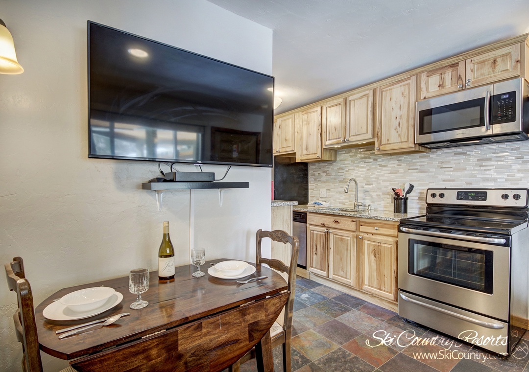 Upon entering unit 5D, you'll be greeted by stunning tile floors that exude a sense of sophistication and warmth. The centerpiece of the living room is its 55-inch flat-screen TV (equipped with cable), which is perfect for offering relaxation after a day of mountain adventure.