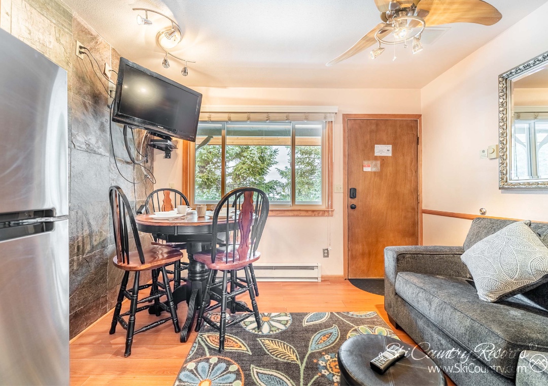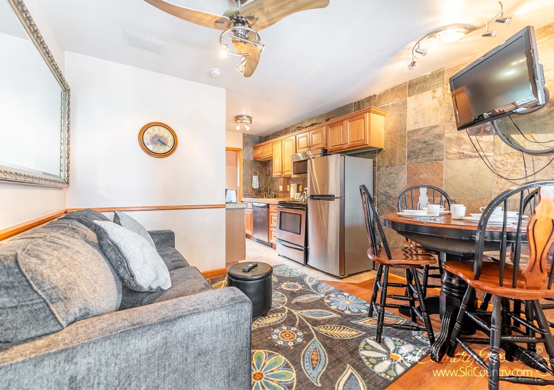 As you enter the living room, you'll be captivated by the cozy atmosphere. A 28” flat screen TV with cable/DVD/Blu-ray invites you to unwind, while a ceiling fan gently stirs the refreshing mountain air. An eye-catching copper slate accent wall adds character to the space, creating the perfect backdrop for your evenings in.