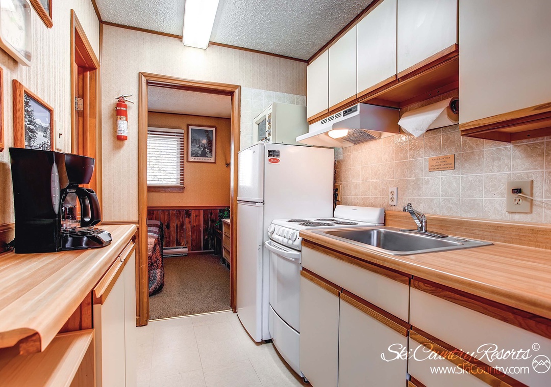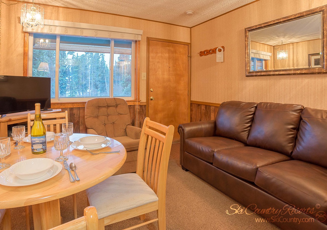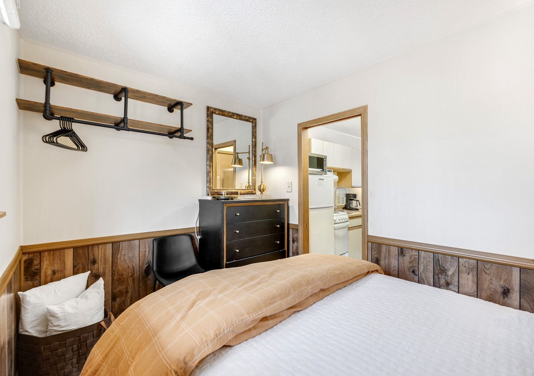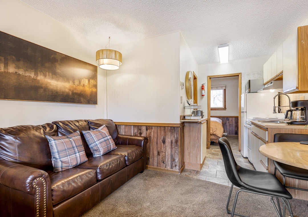 Inside this cozy top-floor, one-bedroom unit discover 300 square feet of charm and comfort. In the living room, a large comfortable leather sofa invites relaxation, accompanied by a 19” TV equipped with cable/DVD for your entertainment. In the bedroom, you'll find a queen-size bed, small dresser and a convenient clothes rack to easily stow all your Summer or Winter mountain apparel.