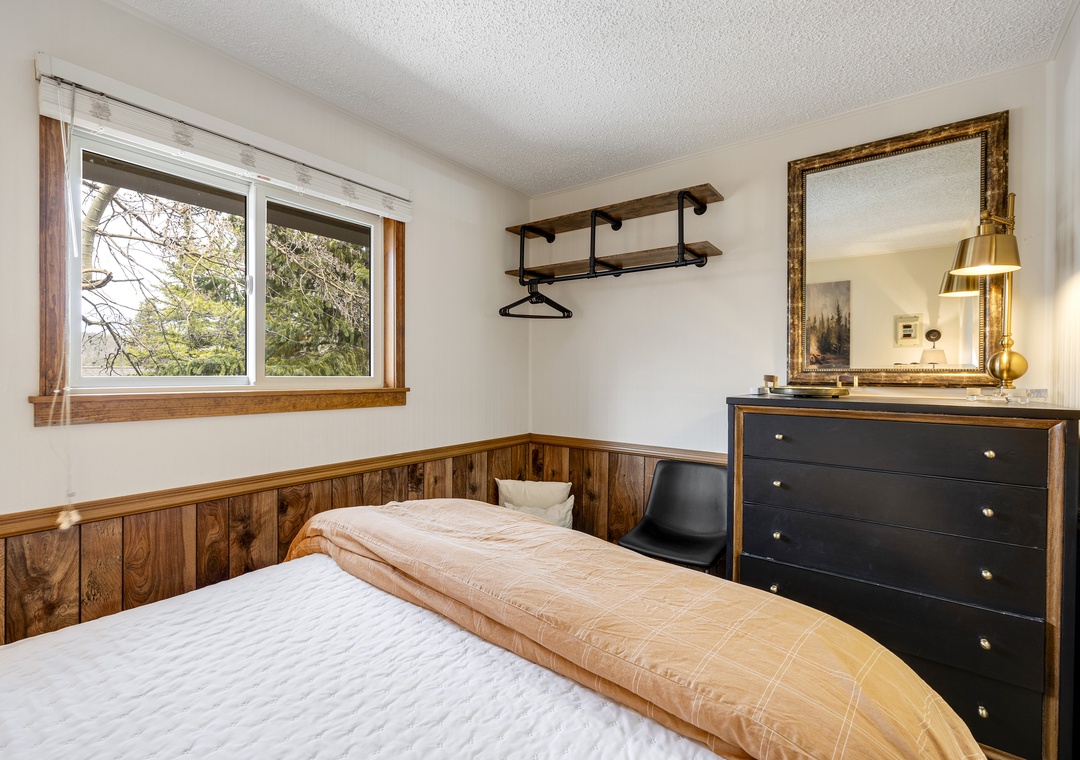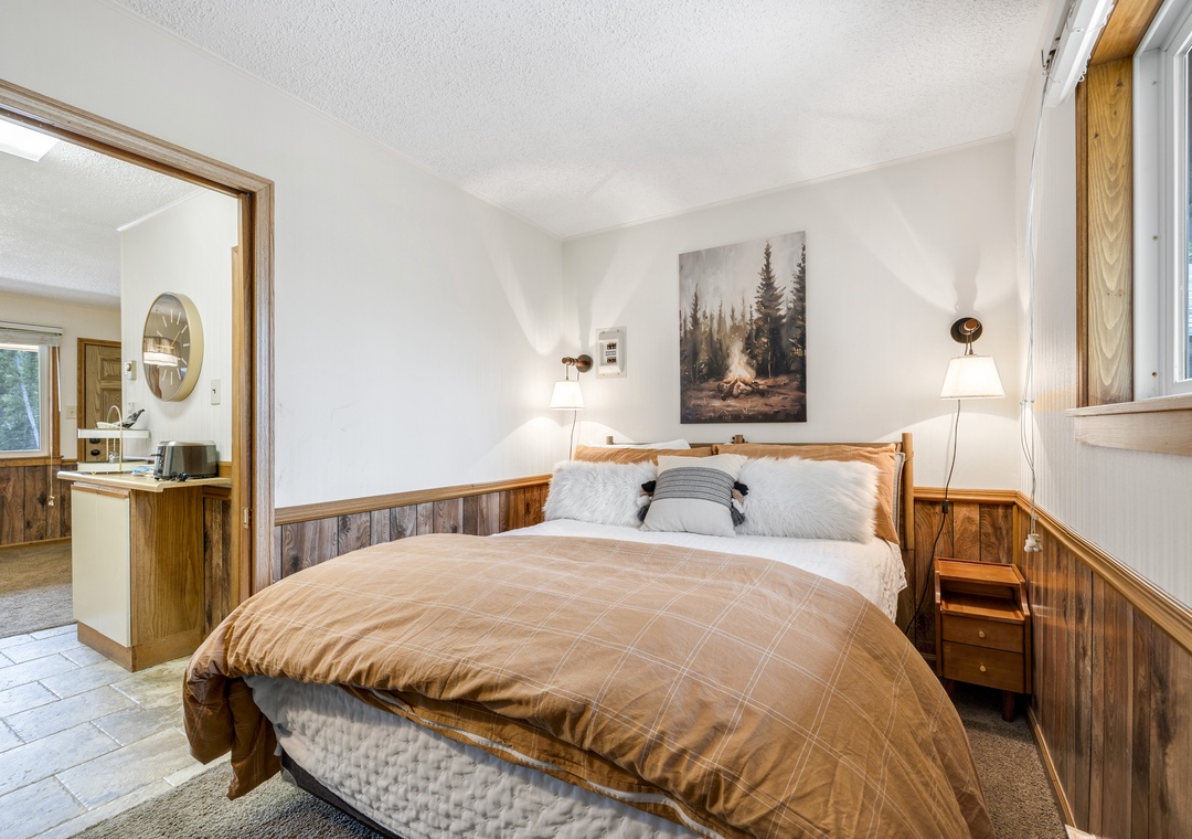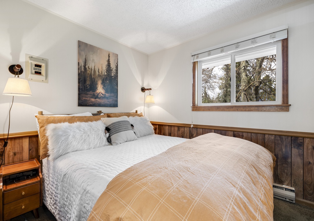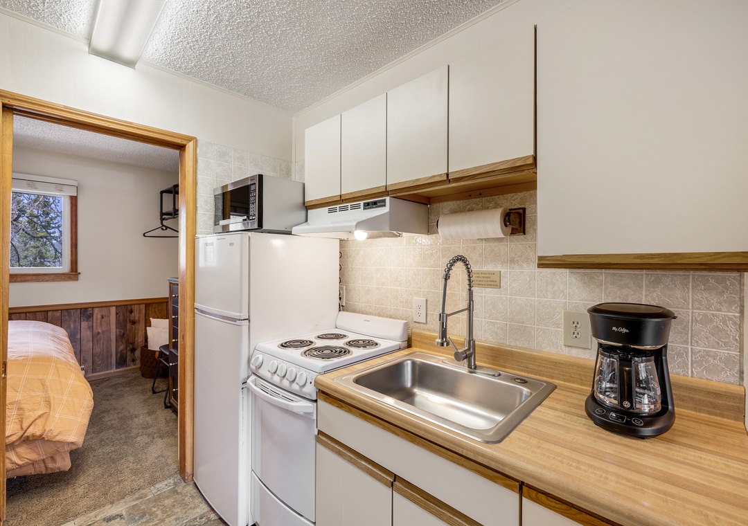 Inside this cozy top-floor, one-bedroom unit discover 300 square feet of charm and comfort. In the living room, a large comfortable leather sofa invites relaxation, accompanied by a 19” TV equipped with cable/DVD for your entertainment. In the bedroom, you'll find a queen-size bed, small dresser and a convenient clothes rack to easily stow all your Summer or Winter mountain apparel.