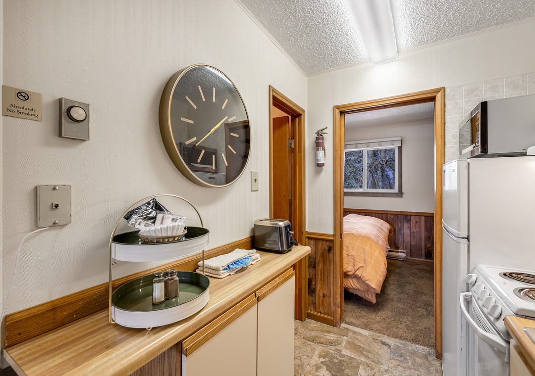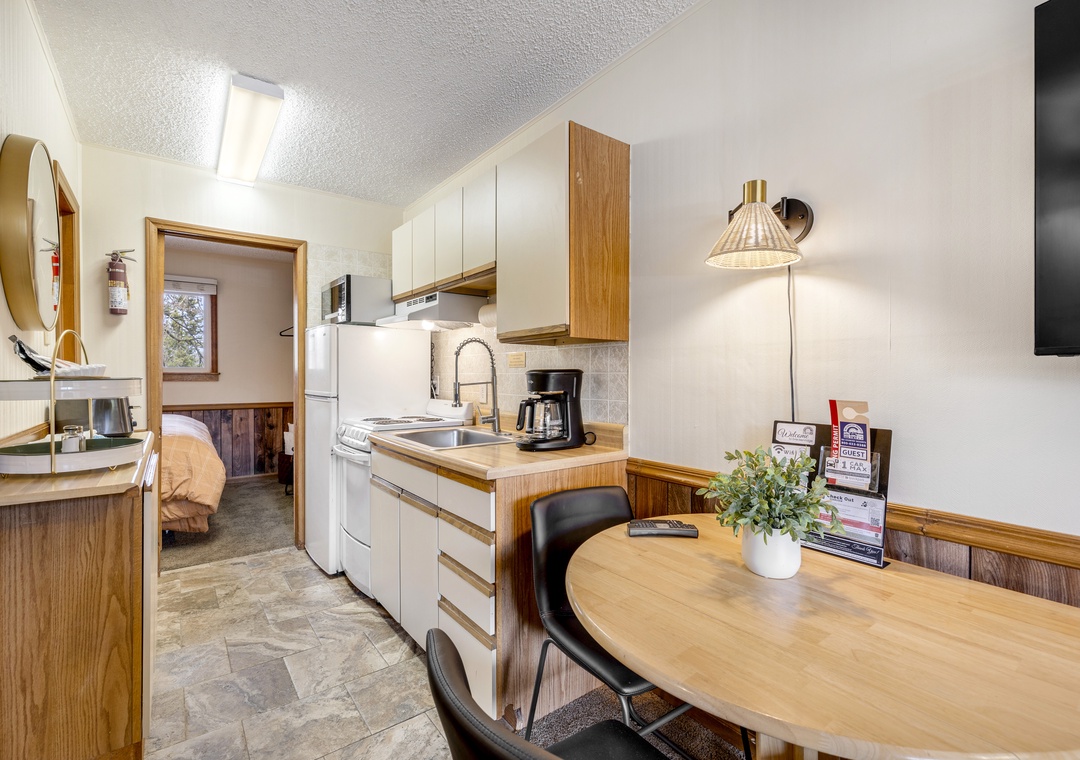 The fully-loaded kitchenette is equipped with all the essentials: cooking and dining utensils, a refrigerator, small stove, microwave, toaster, and a coffee maker to kickstart your day. Gather around the table for three and savor a delicious homemade meal in the comfort of your own unit.
