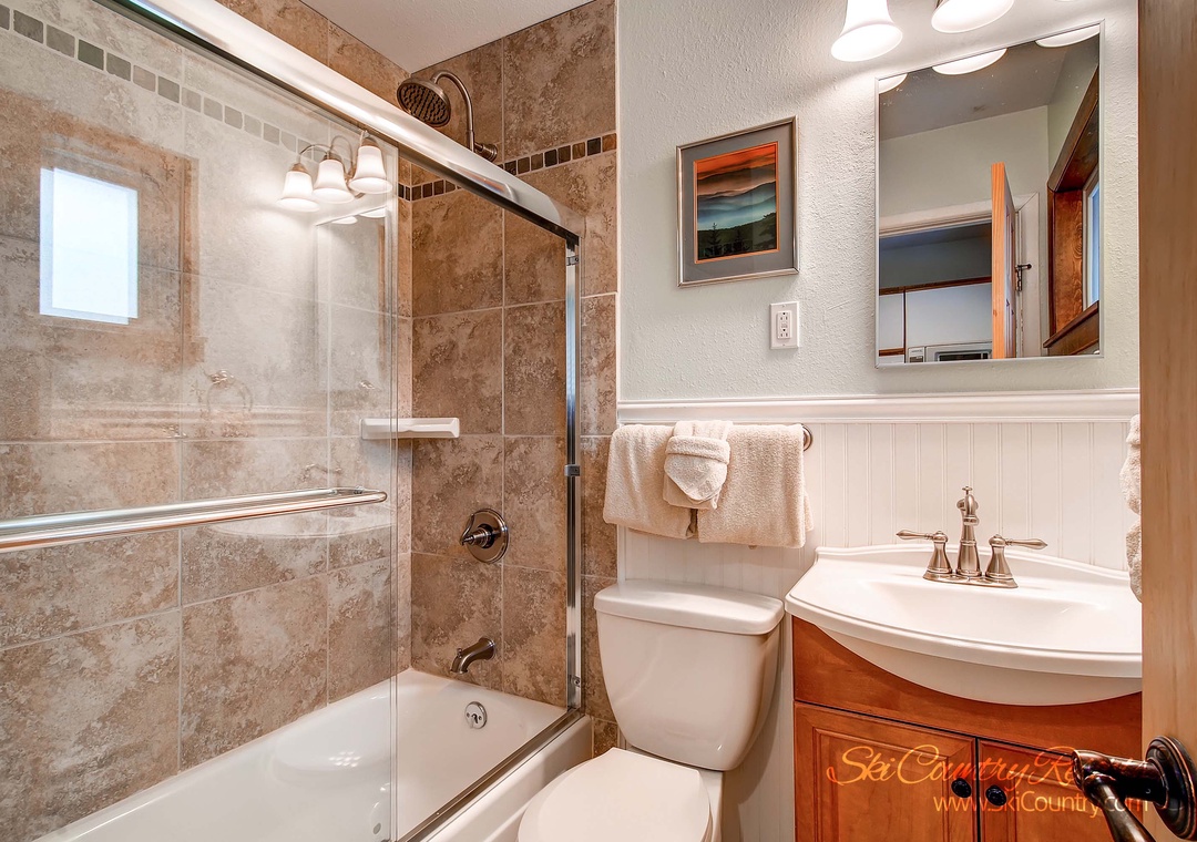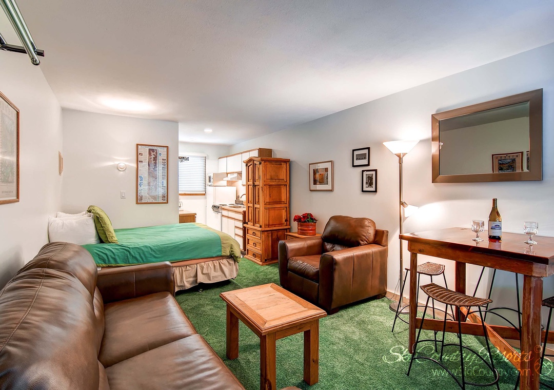 Relax and unwind in the tastefully furnished living area, featuring a plush leather couch and a cozy armchair where you can curl up with a good book or your favorite movie on the 16-inch TV with cable, DVD and VCR. After a thrilling day on the slopes, rejuvenate in the updated bathroom, boasting new tile and an oversized showerhead that promises a soothing and warm shower experience.