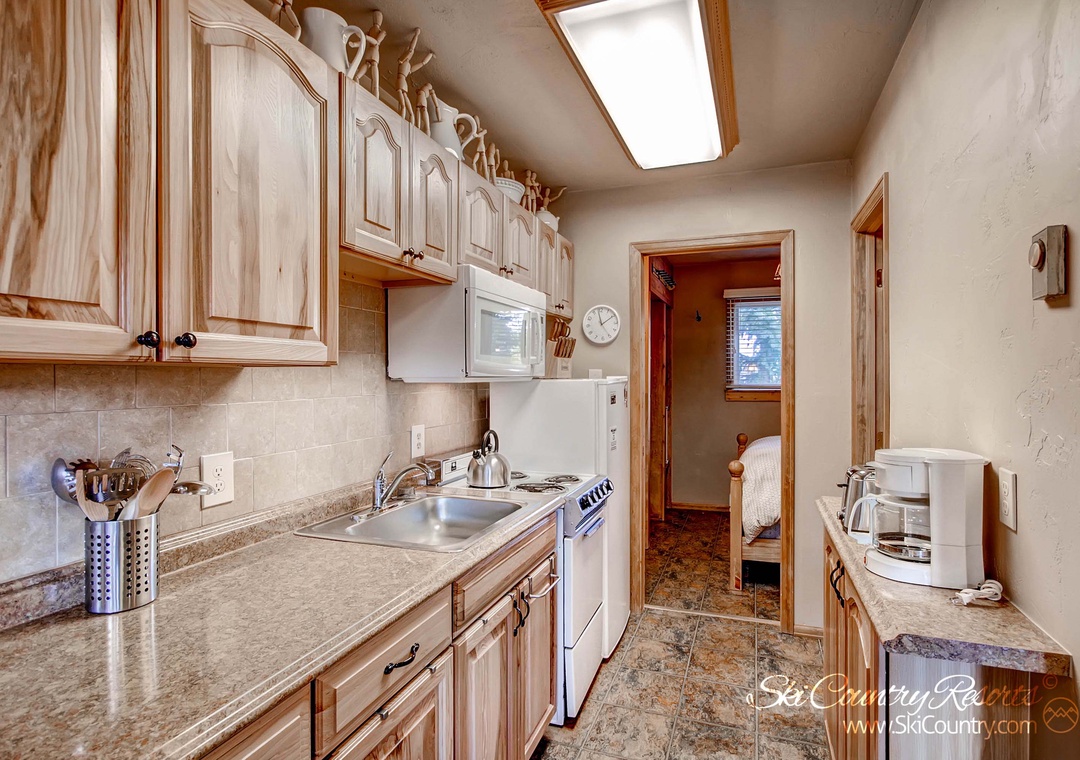 In the fully updated kitchenette you will find new laminate countertops and sleek maple cabinets, all thoughtfully stocked with every essential. Whether you're preparing a gourmet meal or a quick snack, you'll find everything you need including a refrigerator, stove, microwave, toaster, coffee maker and even a tea kettle to effortlessly prepare a soothing cup of tea or hot cocoa after a day of mountain adventure.