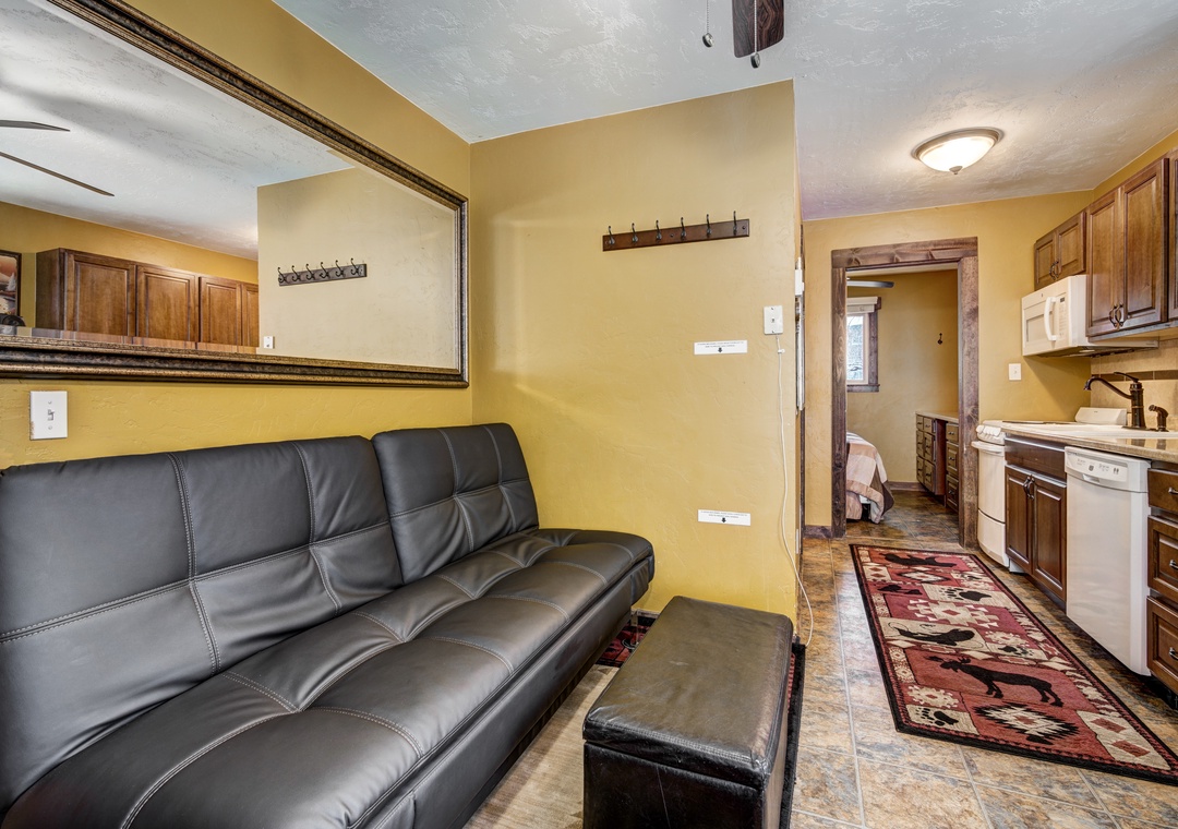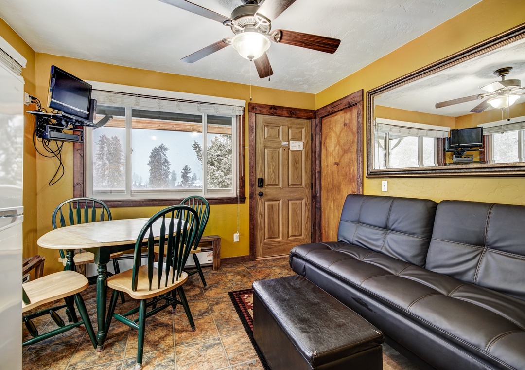 Step inside this renovated second-floor corner unit, and you'll be greeted by a space that combines comfort and style seamlessly. The living room is a haven of relaxation, featuring a 16” flat-screen TV with cable/DVD/VCR for your entertainment and the luxe leather couch (that conveniently folds out to provide extra sleeping space) offers an ideal spot to relax and unwind. Following an exciting day of discovering the natural beauty surrounding Breckenridge, the ceiling fan stands ready to bring a refreshing coolness to the space. Additionally, the vinyl flooring throughout makes handling any snow or outdoor debris that may be brought in after your adventures exceptionally easy.
