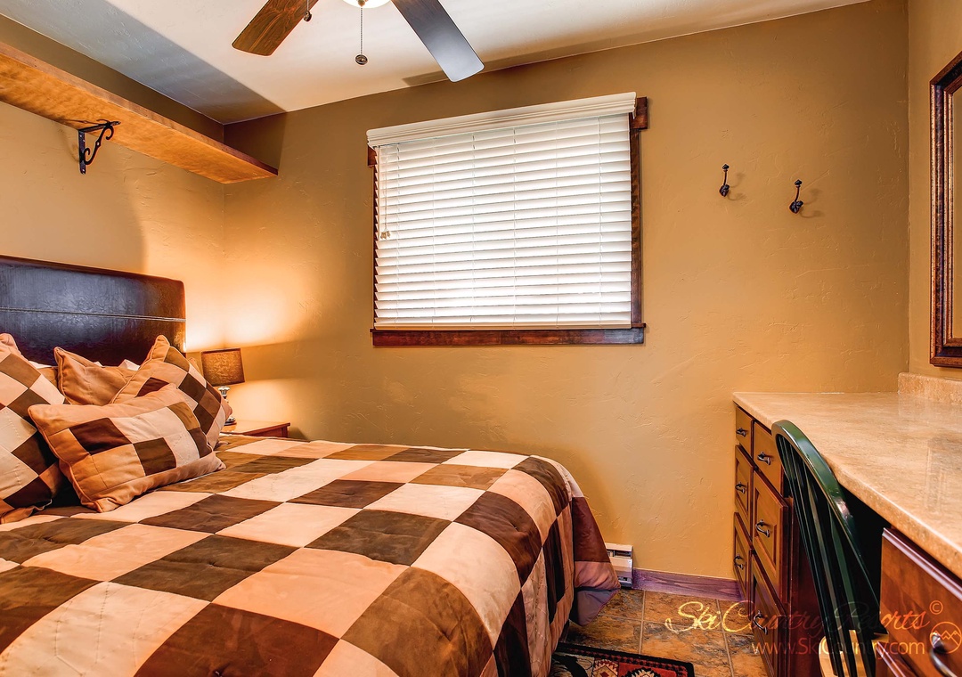 The bathroom boasts an oversized, rain showerhead that promises a warm and soothing shower, the perfect way to unwind. And the bedroom is a peaceful retreat, complete with a built-in desk, another ceiling fan and luxurious pillow-top Queen bed to ensure a restful night's sleep.