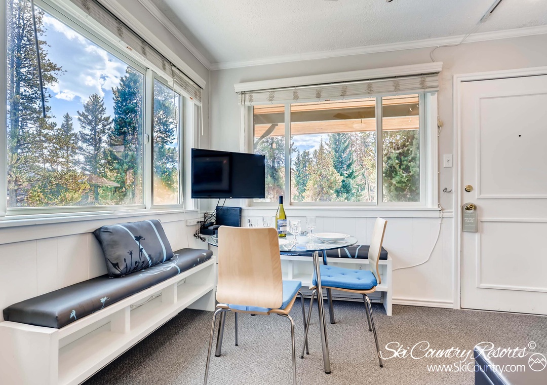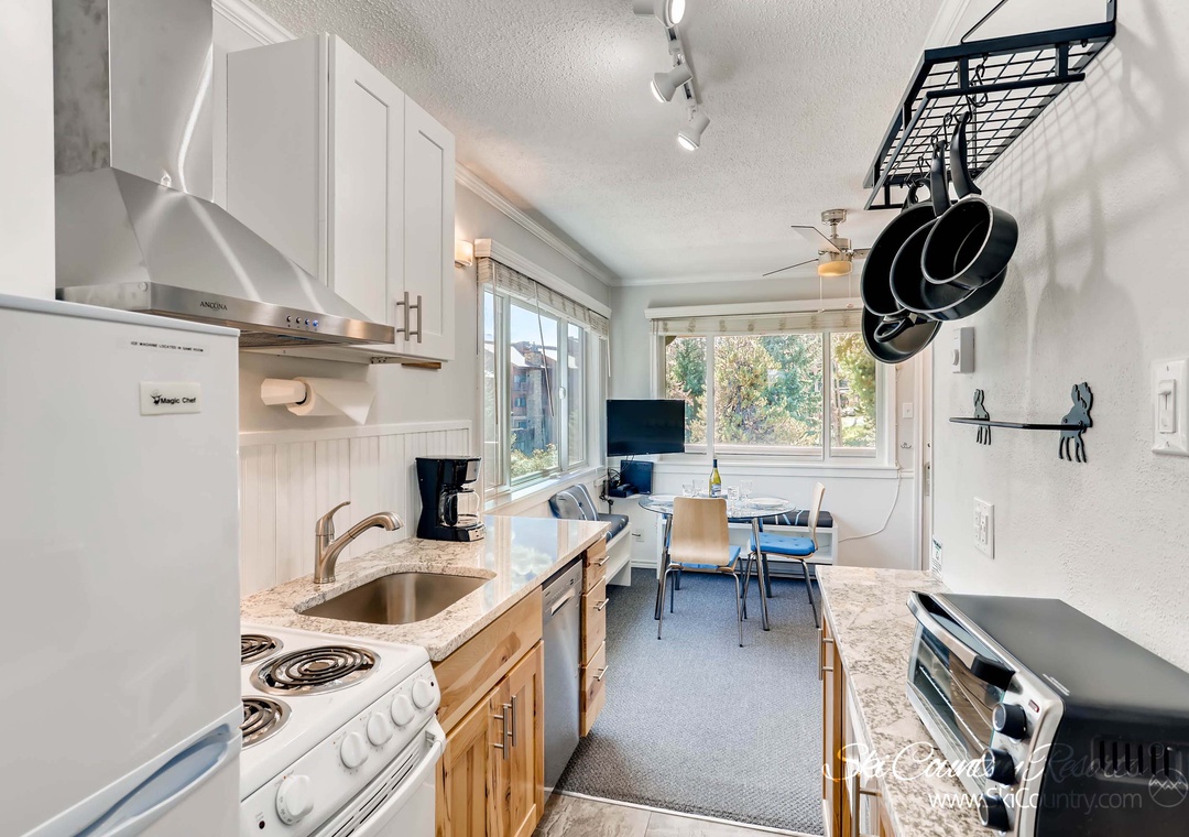 Experience the elegance and modernity of this bright one bedroom unit, 8C (managed by Ski Country Resorts Vacation Rentals). Its updated kitchen exudes a sense of luxury, equipped with stainless steel appliances and sleek granite countertops. Culinary delights are at your fingertips within this fully loaded kitchenette, where every detail has been considered. From the compact four-burner range to the microwave, toaster oven, dishwasher, garage disposal and coffee maker. Savor your creations at the modern glass table, surrounded by chairs and dinette benches.. that double as a convenient storage solution with discreet cubbies – a thoughtful touch that exemplifies this unit's commitment to comfort.
