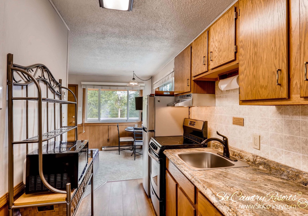 Unit 8D, a meticulously curated one bedroom unit (managed by Ski Country Resorts Vacation Rentals) offers a top floor, corner location with a sense of comfort and style. This darling oasis boasts a tasteful ambiance, complete with fresh entry tile and plush carpets. The living room features two expansive windows that will treat you to plenty of natural light and captivating views of vistas and the wooded creek area that runs behind the complex. If relaxation calls for cinematic entertainment, indulge in movie nights on the 22" flat screen TV, while perched upon the plush sofa sleeper that invites you to unwind.