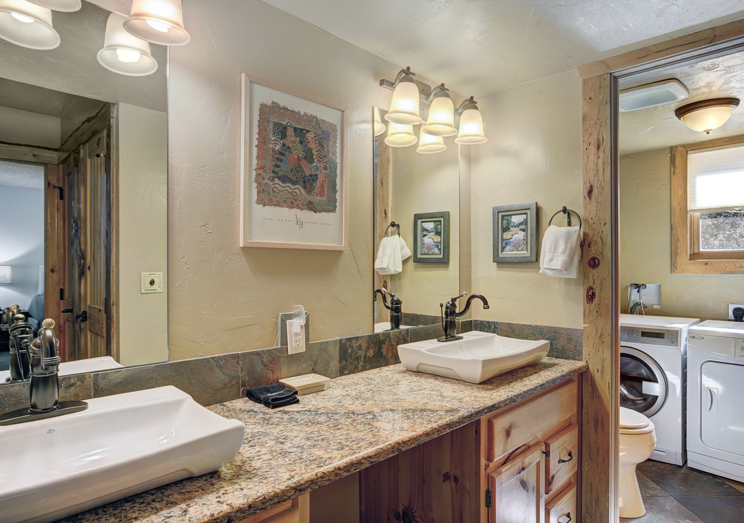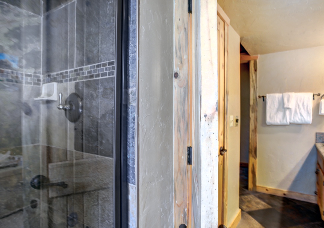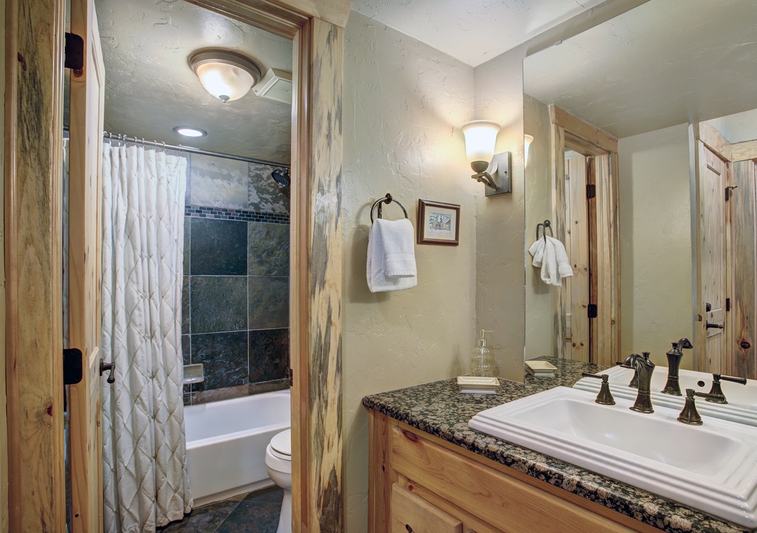 The interior boosts a spacious living room complete with an oversized couch with plenty of room for your group or family. A fully stocked kitchen makes mealtime effortless and enjoyable. The dining area, where you can create core memories over meals, game time, or great conversations. Each bedroom has an attached full bathroom, all of which are beautifully designed for your comfort. Finally, end your day of adventures cozied up to the stunning fireplace, a perfect finale.